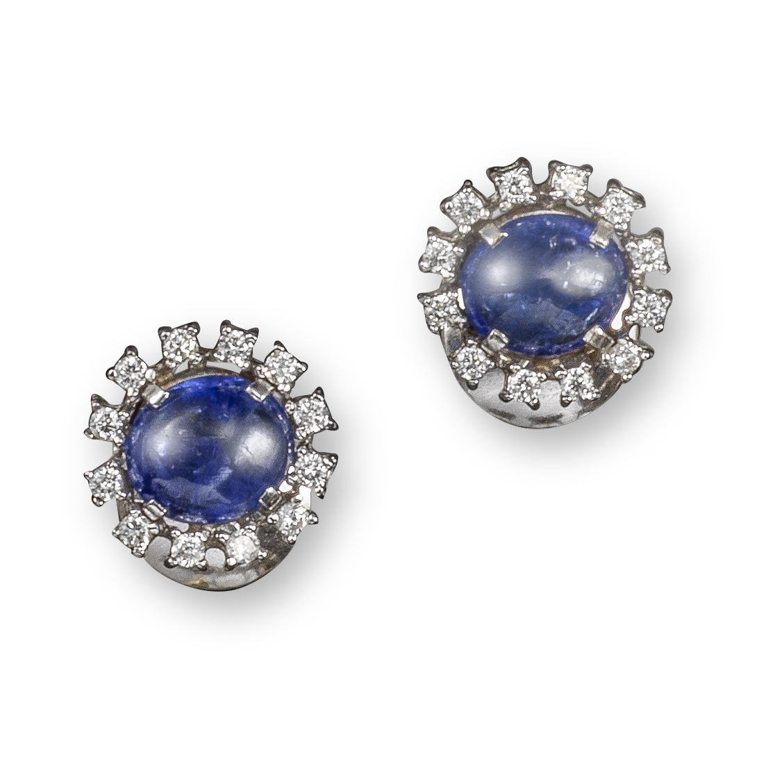 A pair of sapphire and diamond cluster earrings, the oval cabochon sapphires are set within a surround of round brilliant-cut diamonds in white gold, post fittings, each 1.2cm high
