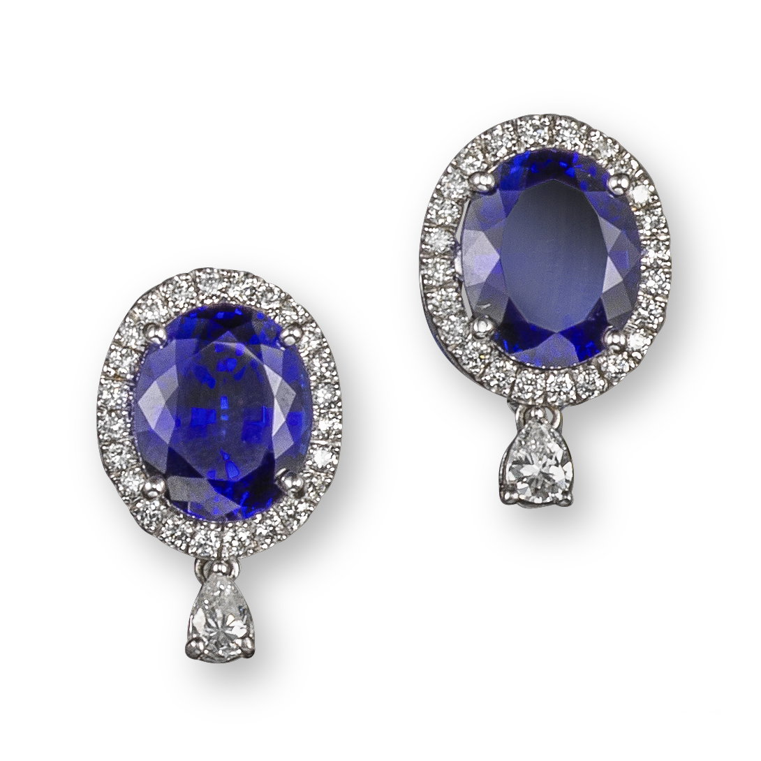 A pair of synthetic sapphire and diamond cluster ear studs, the oval-shaped synthetic sapphires are set within a surround of circular-cut diamonds, each suspending a pear-shaped diamond, in white gold, 2cm high