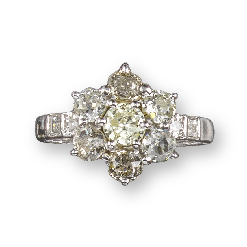 A diamond cluster ring, the old circular-cut diamonds are claw-set with a baguette-shaped diamond to each shoulder in white gold, size Q 1/2