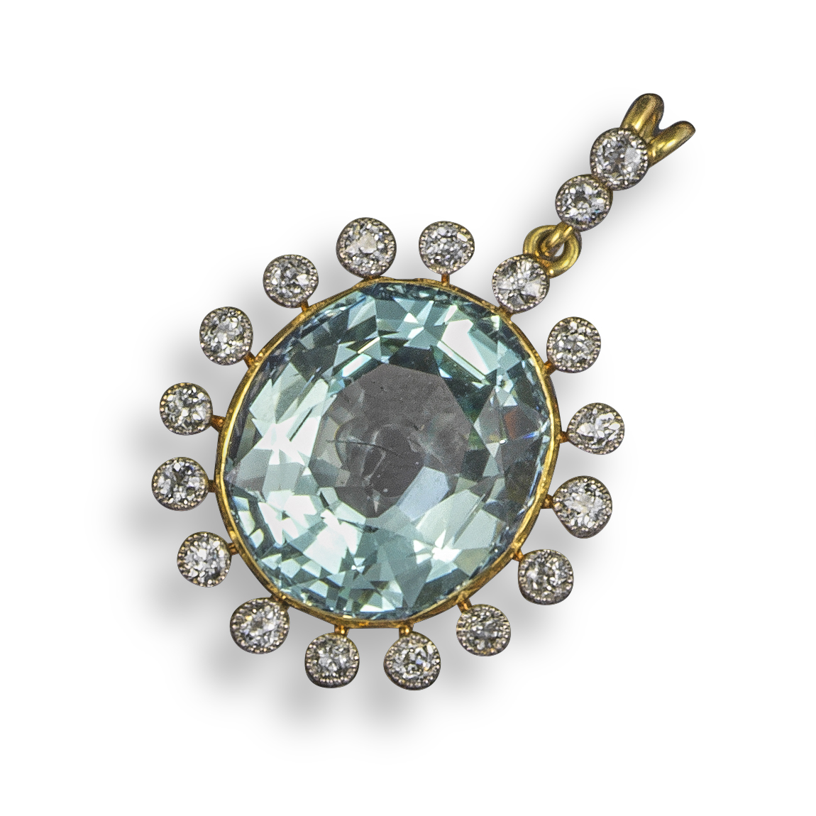 An Edwardian aquamarine and diamond pendant, the oval-shaped aquamarine set within a surround of old circular-cut diamonds, with further diamonds to the bale in yellow gold, 3.5cm high