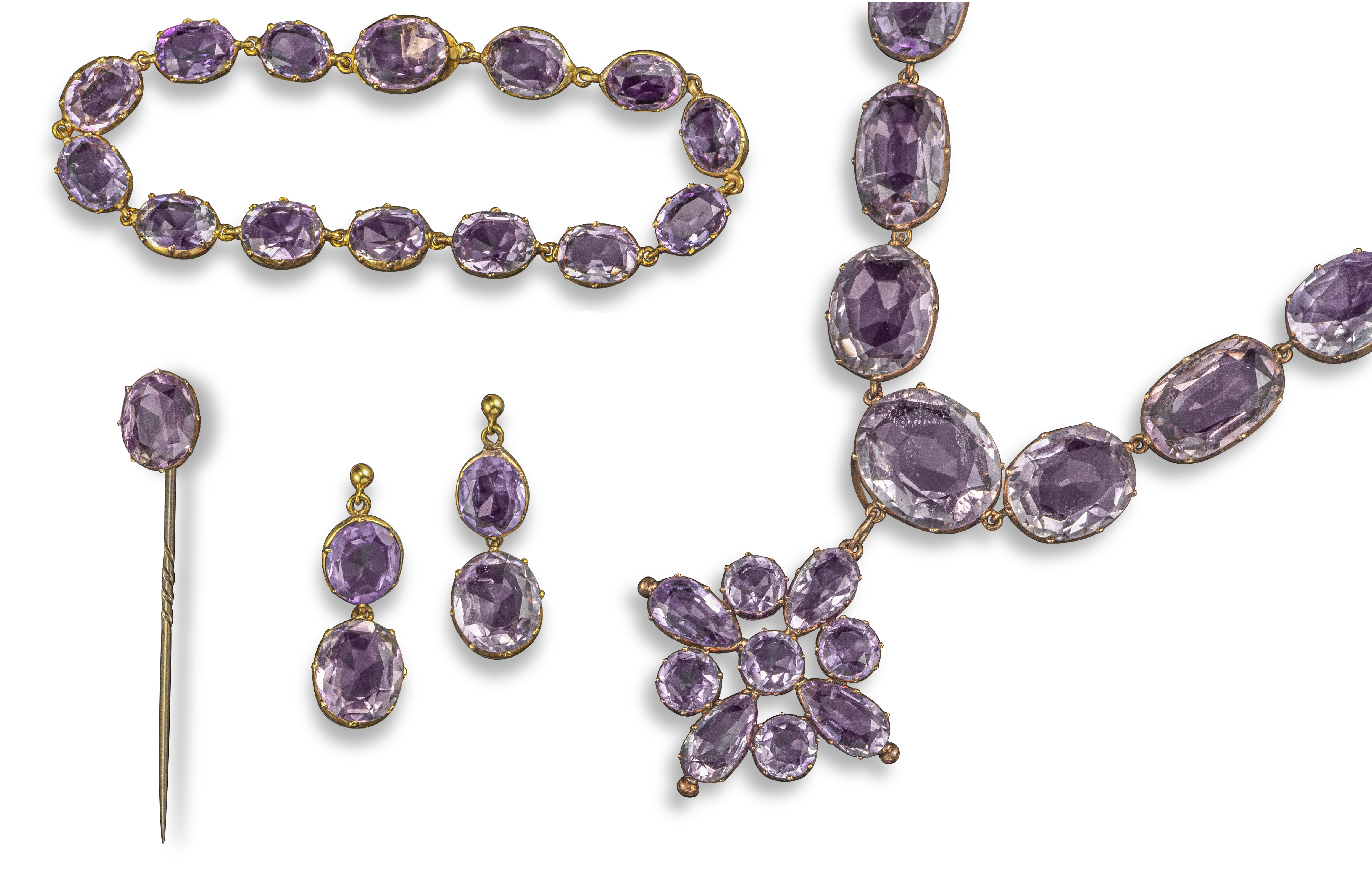 A Victorian amethyst rivière necklace, set with graduated oval-shaped amethysts in gold collets, suspending a flowerhead pendant, with matching bracelet, stickpin and earrings, necklace 44cm long, bracelet 20cm long, earrings 2.5cm high, case