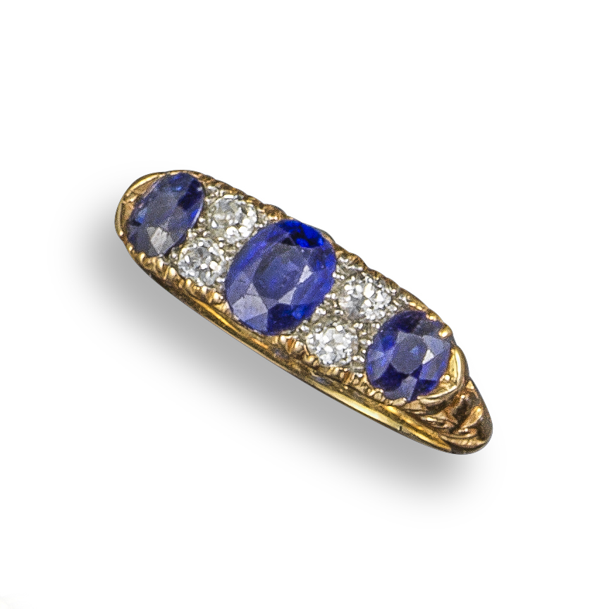 A sapphire and diamond half-hoop ring, set with three graduated oval-shaped sapphires separated with pairs of diamonds in gold, size M