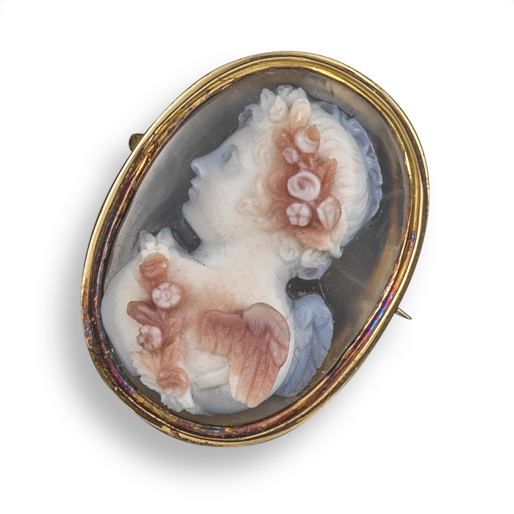 A Victorian carved hardstone cameo brooch, depicting Eros in profile, with plain gold mount, 2.9cm high, case