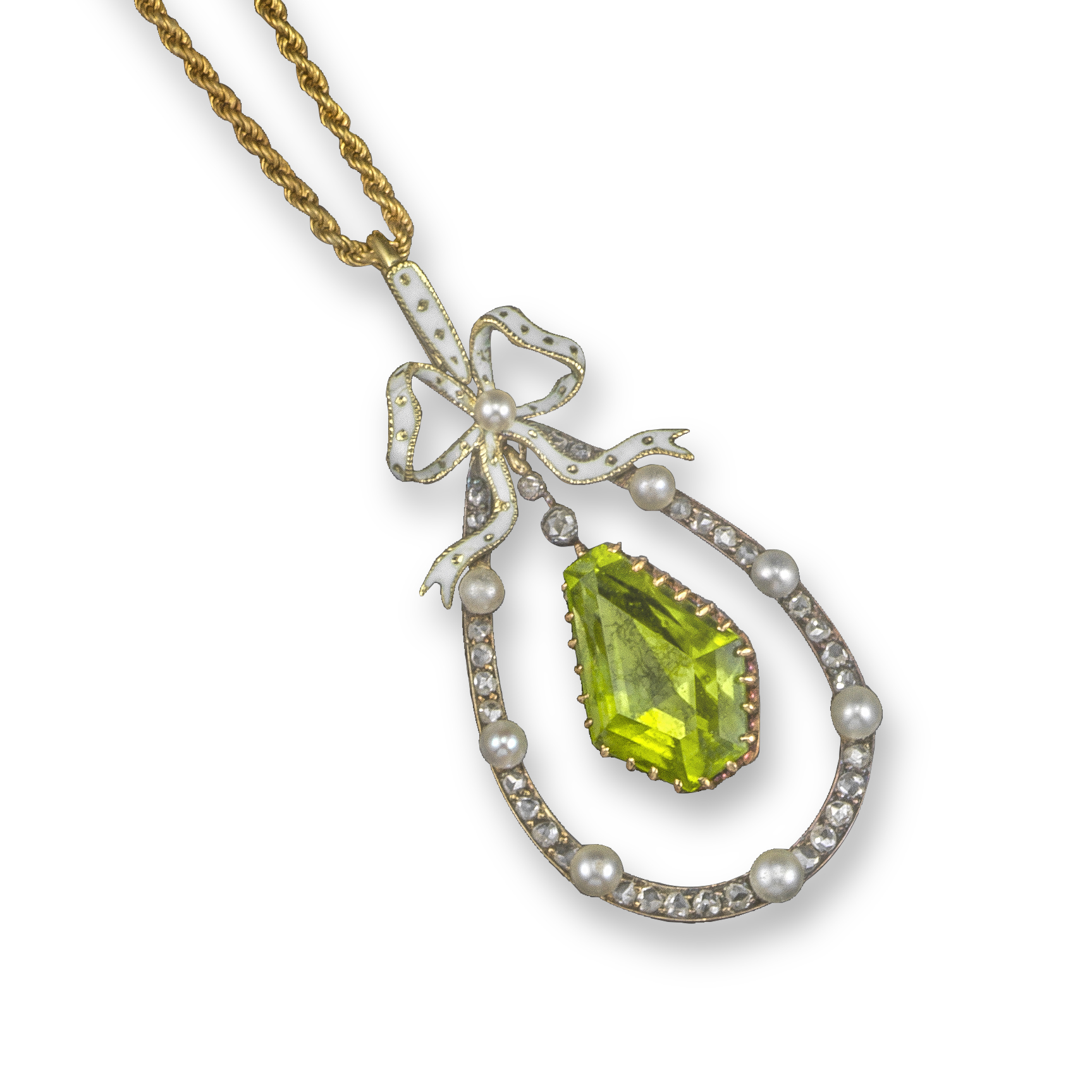 An Edwardian peridot and diamond pendant, the white enamel bow suspends an articulated hexagonal peridot within a border of rose-cut diamonds and seed pearls in platinum and gold, on ropetwist gold chain, 42cm long