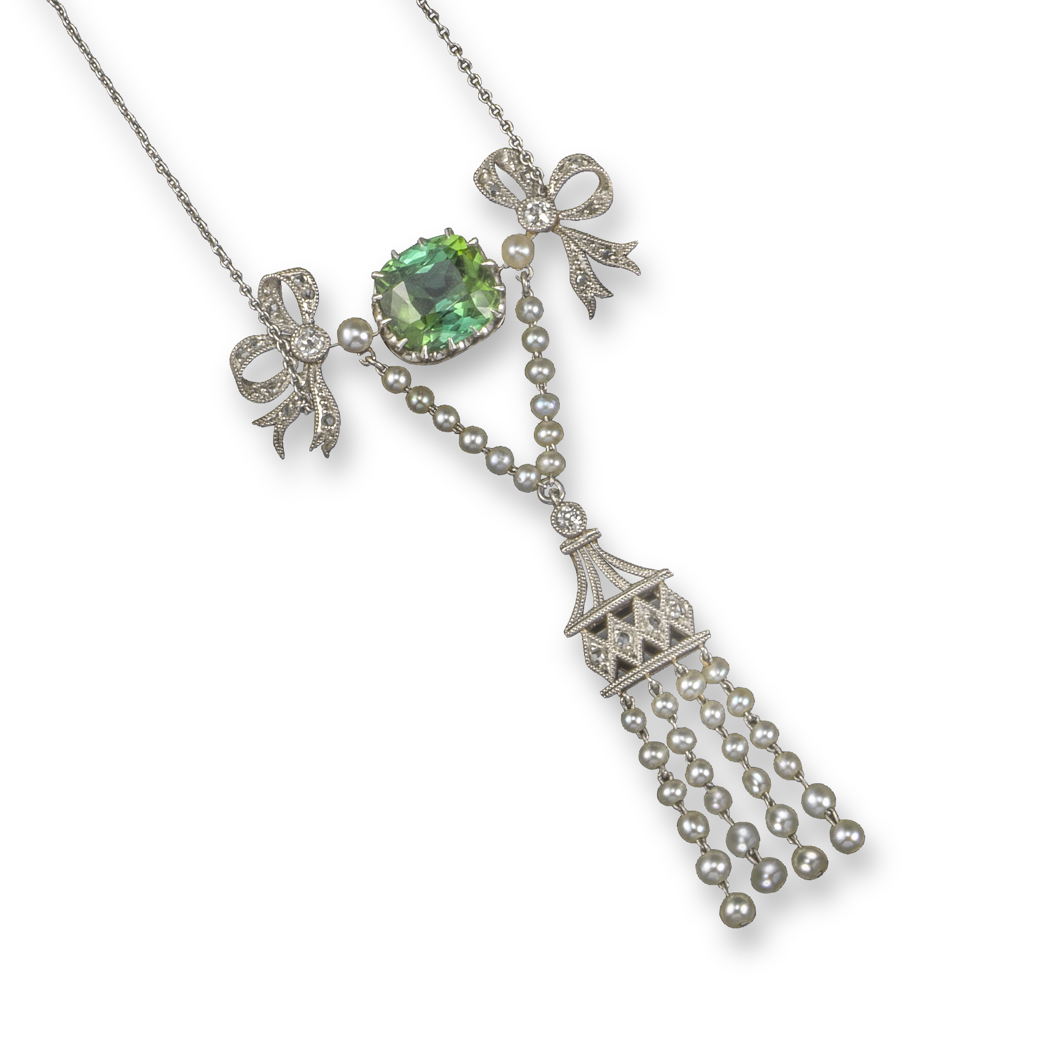 A Belle Epoque tourmaline and diamond pendant, the cushion-shaped tourmaline set within diamond-set bows suspends articulated seeds pearls and a diamond and seed pearl tassel in platinum and gold, 38cm long, case