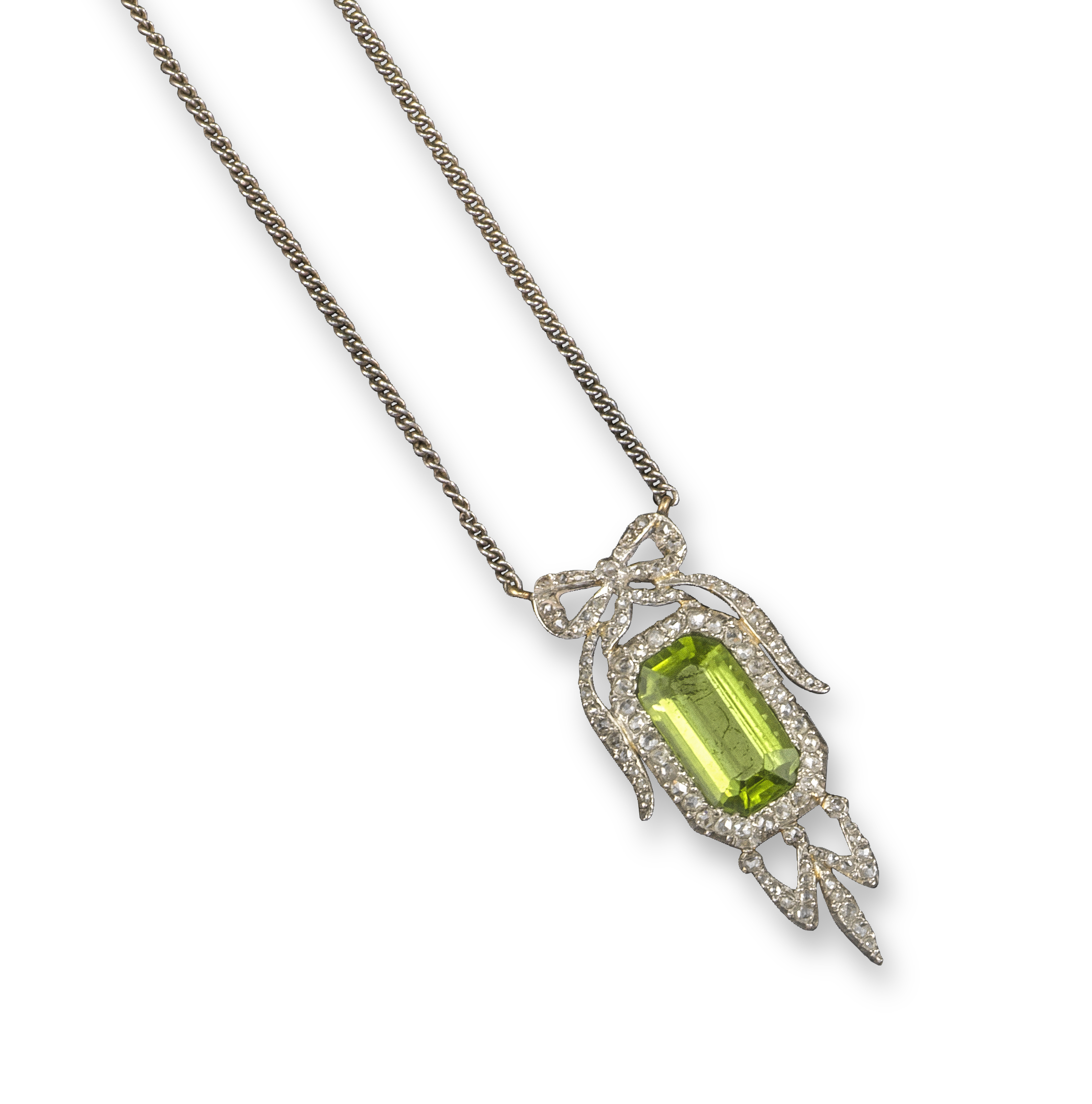 An early 20th century peridot and diamond pendant, the emerald-cut peridot is set within a surround of rose-cut diamonds in platinum and gold, on fine-link silver neck chain, 50cm long