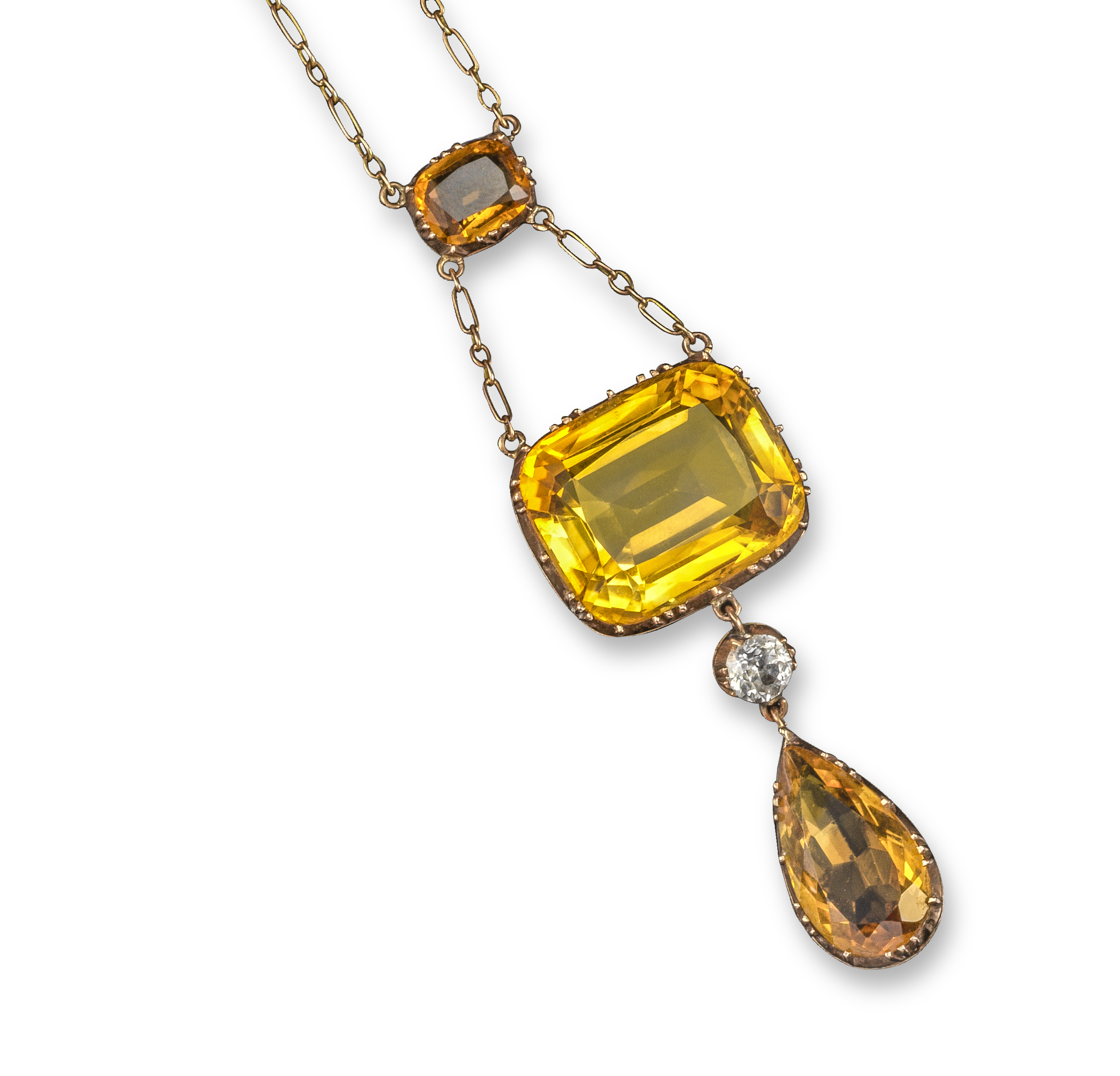 An Edwardian citrine and white sapphire pendant, the graduated cushion-shaped citrines suspend a white sapphire and pear-shaped citrine in gold cut-down collets, on fine-link gold chain, 40cm long