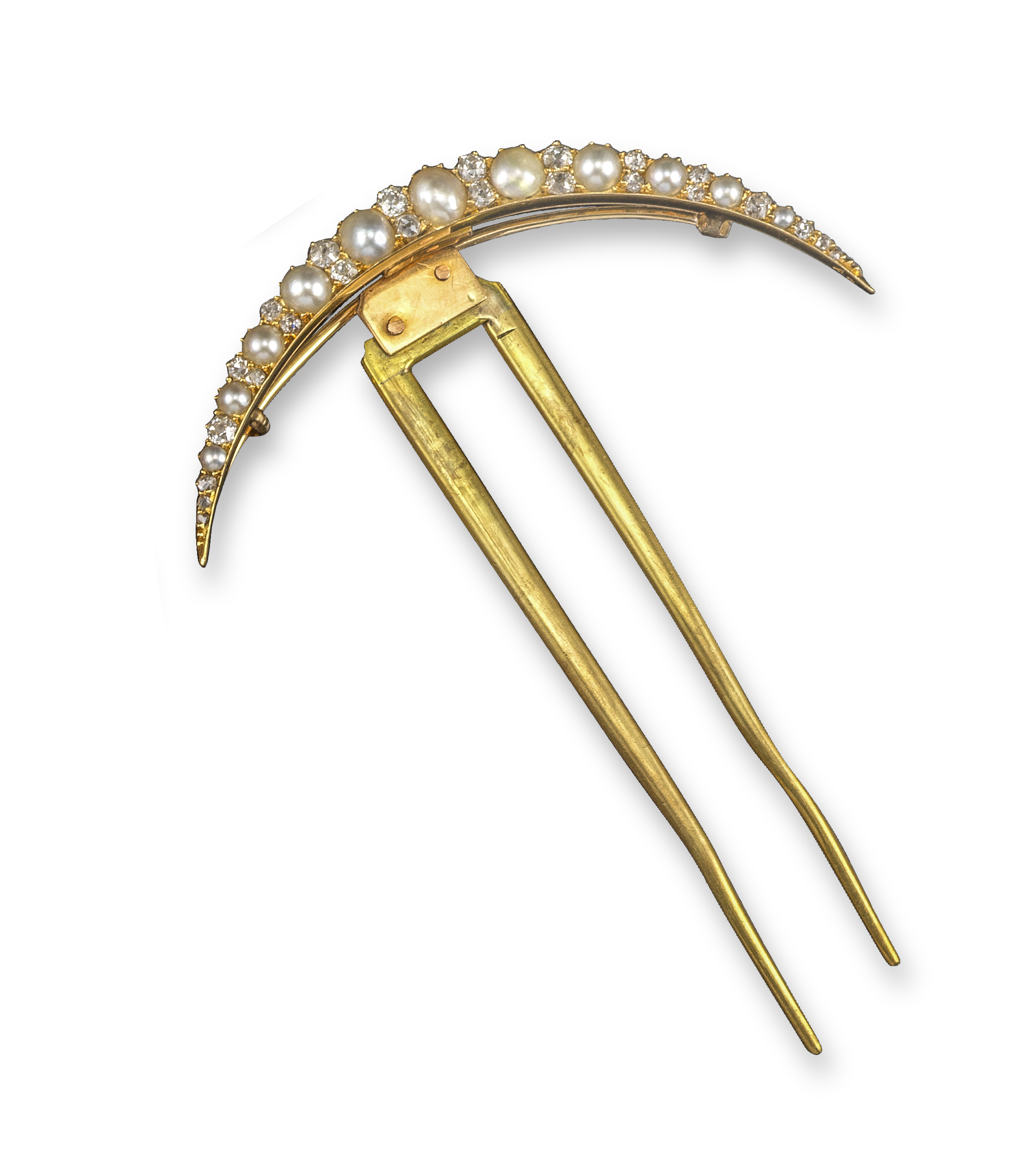 A late Victorian pearl and diamond open crescent brooch, alternately-set with pearls and pair of diamonds in yellow gold, 5.7cm wide, with detachable hair comb