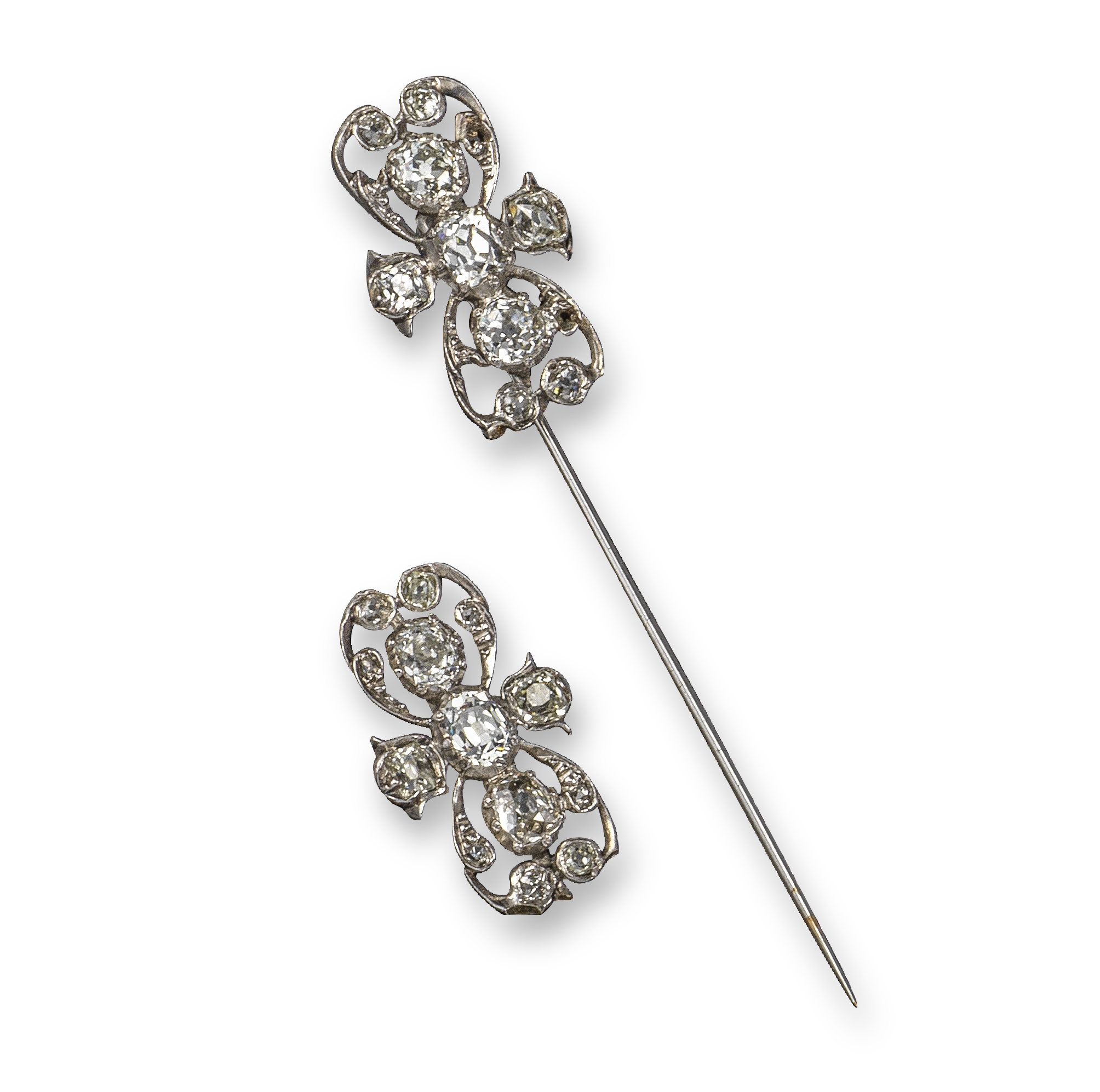 A diamond-set stick pin, of quatrefoil design, set overall with graduated old cushion-shaped diamonds in white gold, with a matching diamond-set plaque, each 2.8cm high