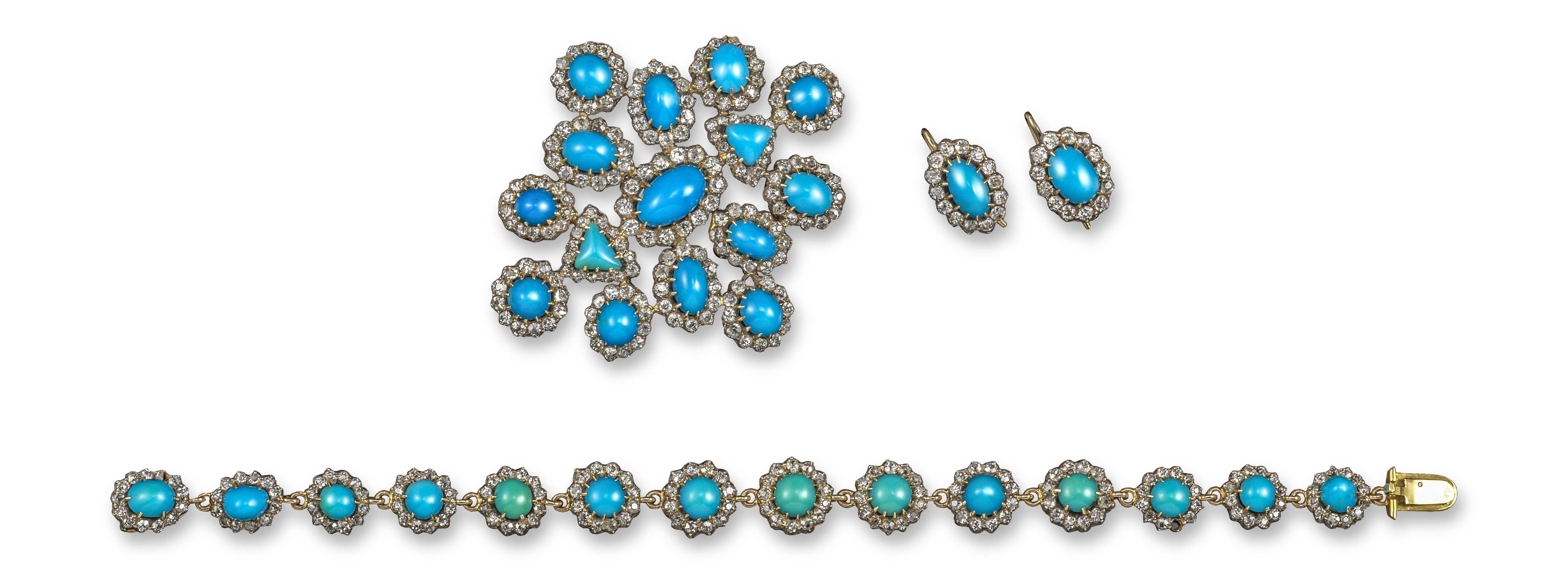 An Edwardian turquoise and diamond suite of jewellery, comprising a bracelet, brooch and (later converted) earrings, set with turquoise cabochons and old cushion-shaped diamonds in silver on gold, brooch 5.5cm wide, bracelet 16.5cm long, earrings with shepherd's hook fittings, each 1.7cm high