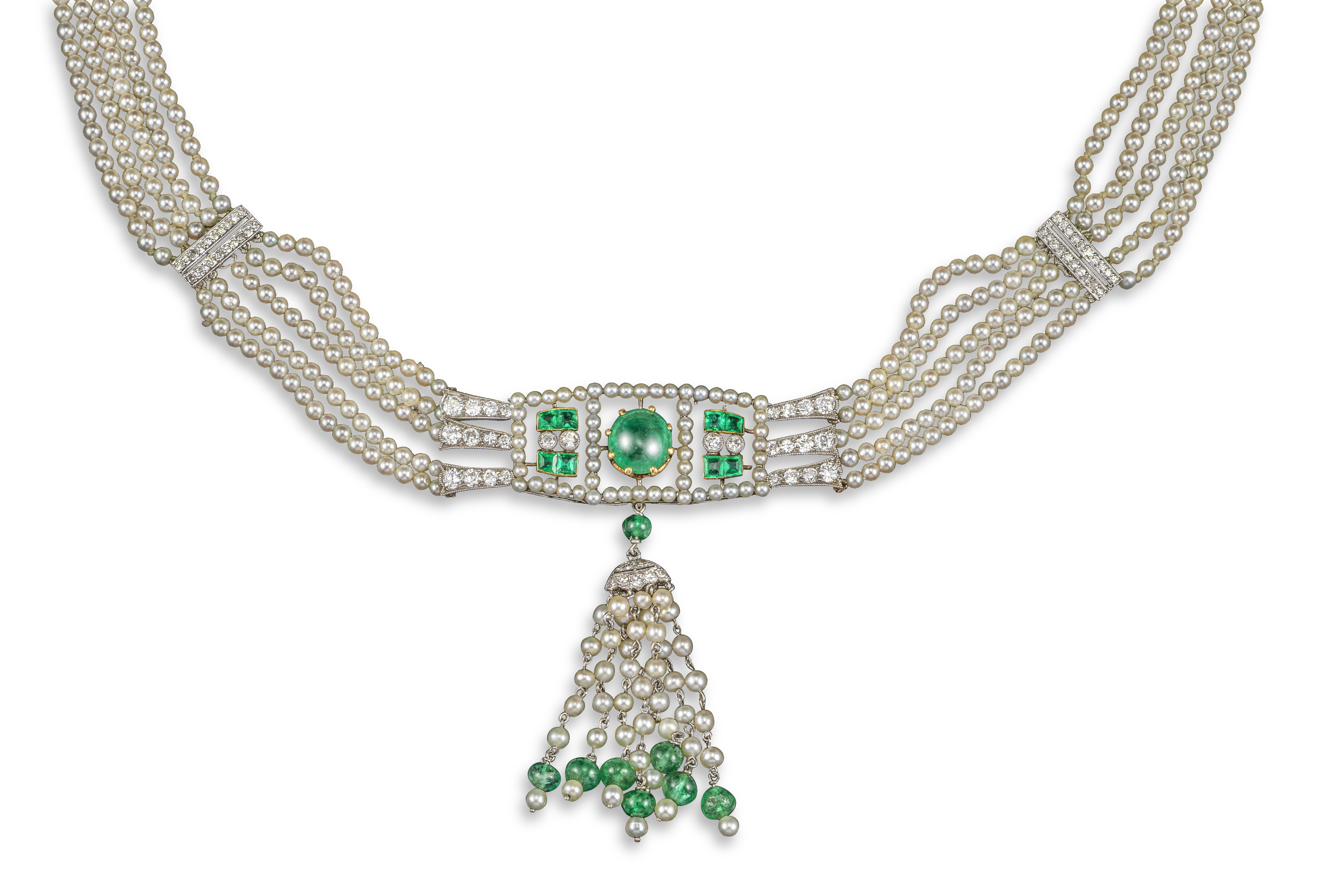 A cultured pearl, emerald and diamond necklace, the central plaque set with an emerald cabochon within diamond, emerald and pearl borders, suspending a spinning diamond-set emerald and cultured pearl tassel on a five-row cultured pearl necklace with diamond spacers and a diamond-set spring-loaded clasp, indistinctly signed Cartier, the necklace with rubbed inventory number, 39cm long