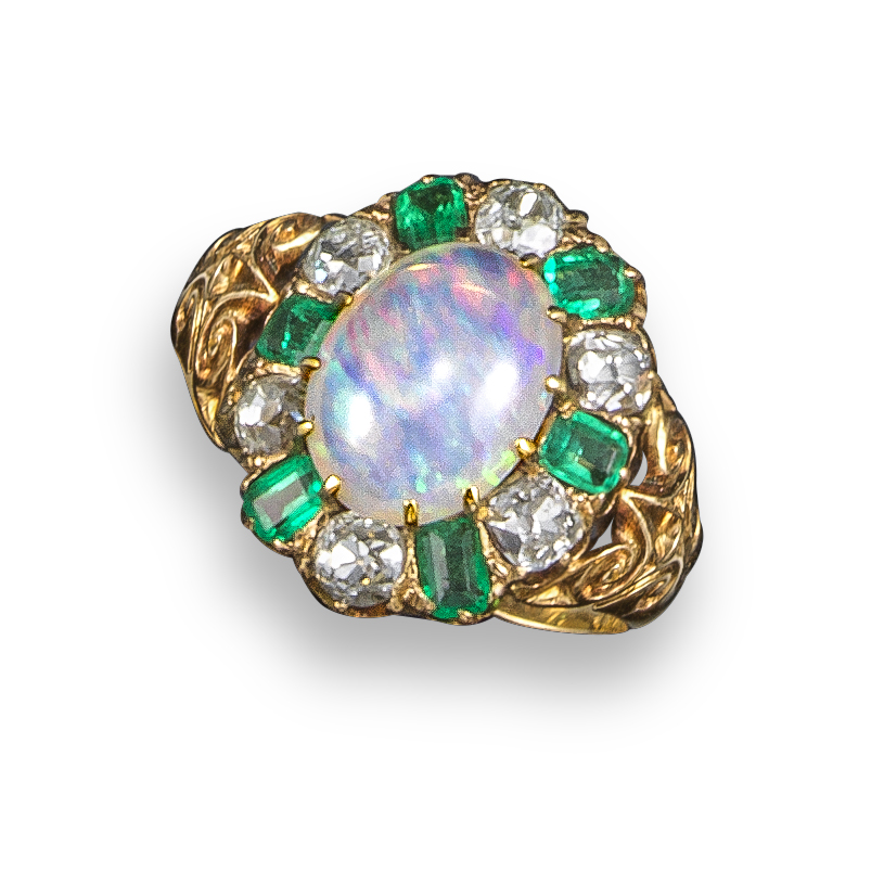 A Victorian opal, emerald and diamond cluster ring, the oval opal cabochon is set within a surround of emeralds and diamonds in scroll engraved 18ct gold shoulders, London hallmarks for 1881, size M 1/2, case