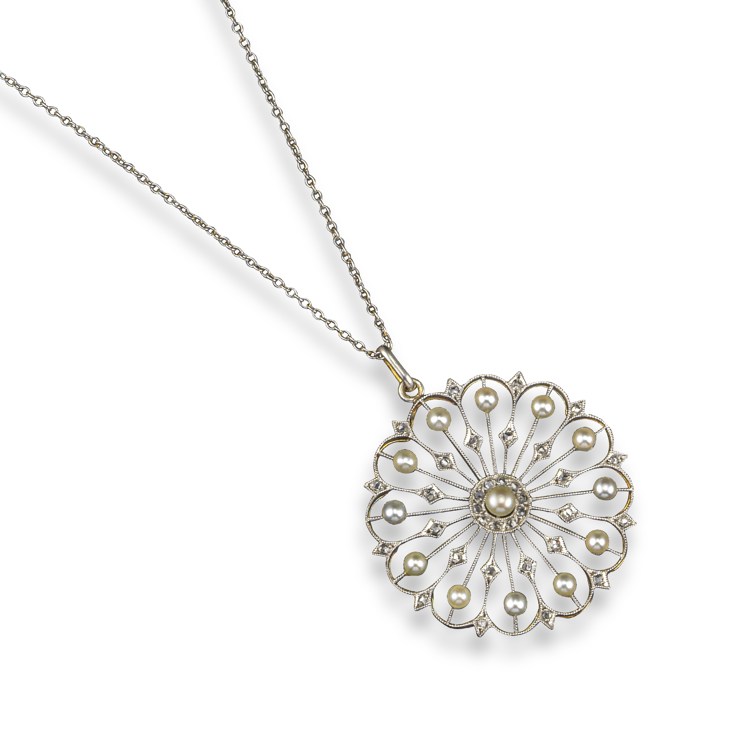An early 20th century seed pearl and diamond pendant, pierced and millegrain-set with rose-cut diamonds and graduated seed pearls within scallop-edged border in platinum and gold, on fine-link platinum neck chain, 50cm long, in case by Tiffany & Co