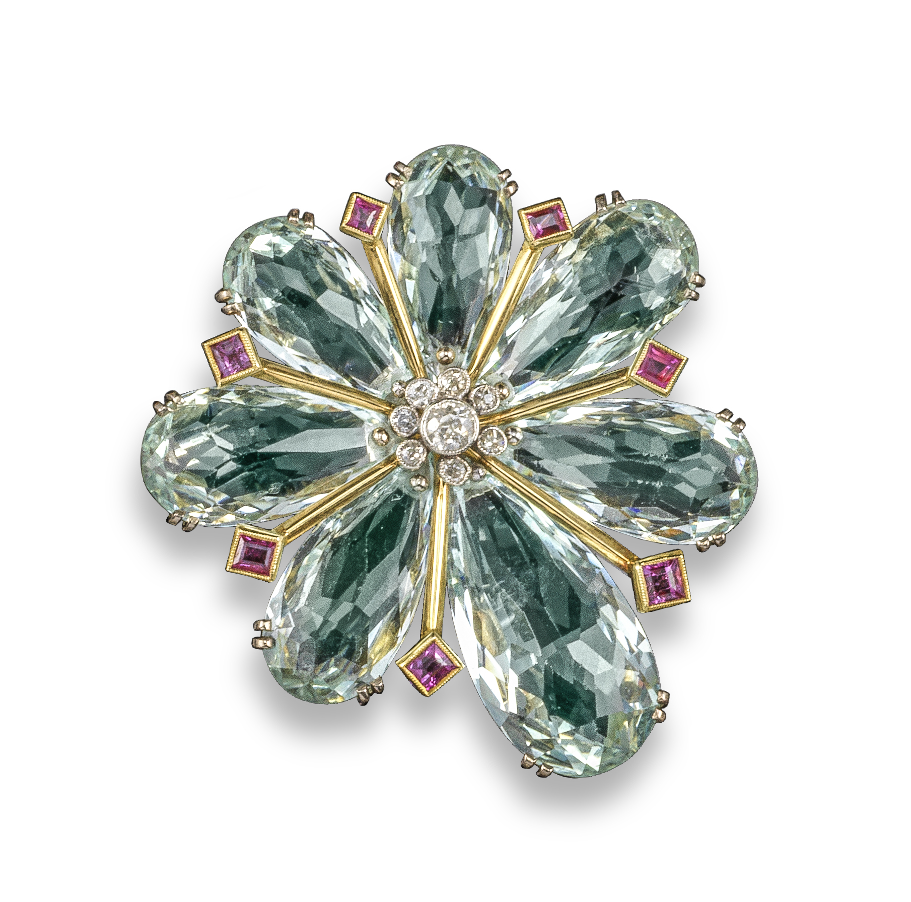 An aquamarine and ruby flower head brooch, set with seven graduated aquamarine briolettes separated with rubies, with a central diamond cluster in platinum and gold, 4.7cm high