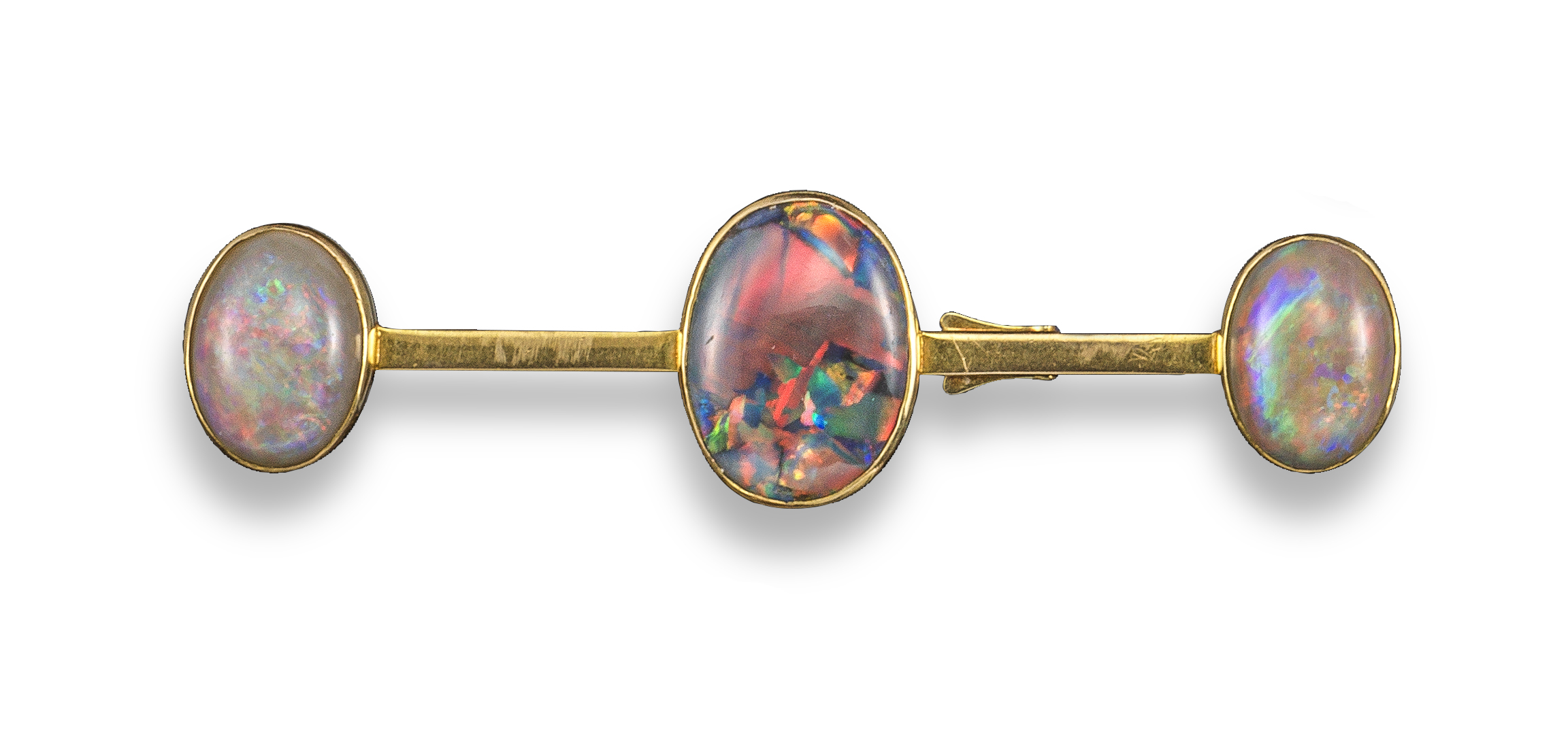A gold brooch set with three oval-shaped opals, the centre oval-shaped solid black opal displays a selection of colours and is set with a white opal to each shoulder in yellow gold, 6.2cm wide, case