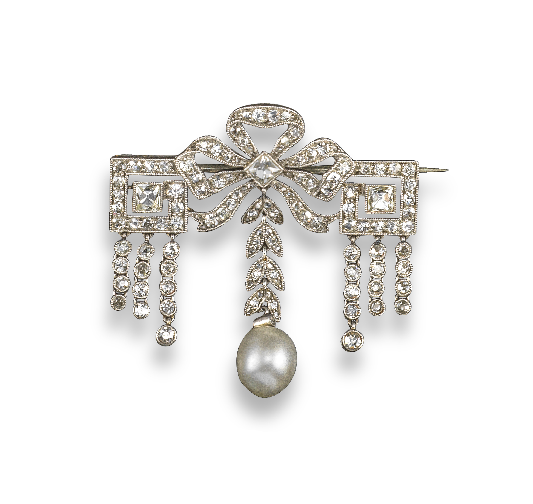 A Belle Epoque pearl and diamond brooch, the stylised bow millegrain-set with diamonds, suspending diamond laurels and a pearl within geometric borders and articulated diamond tassels in platinum, 3.7cm wide, fitted case