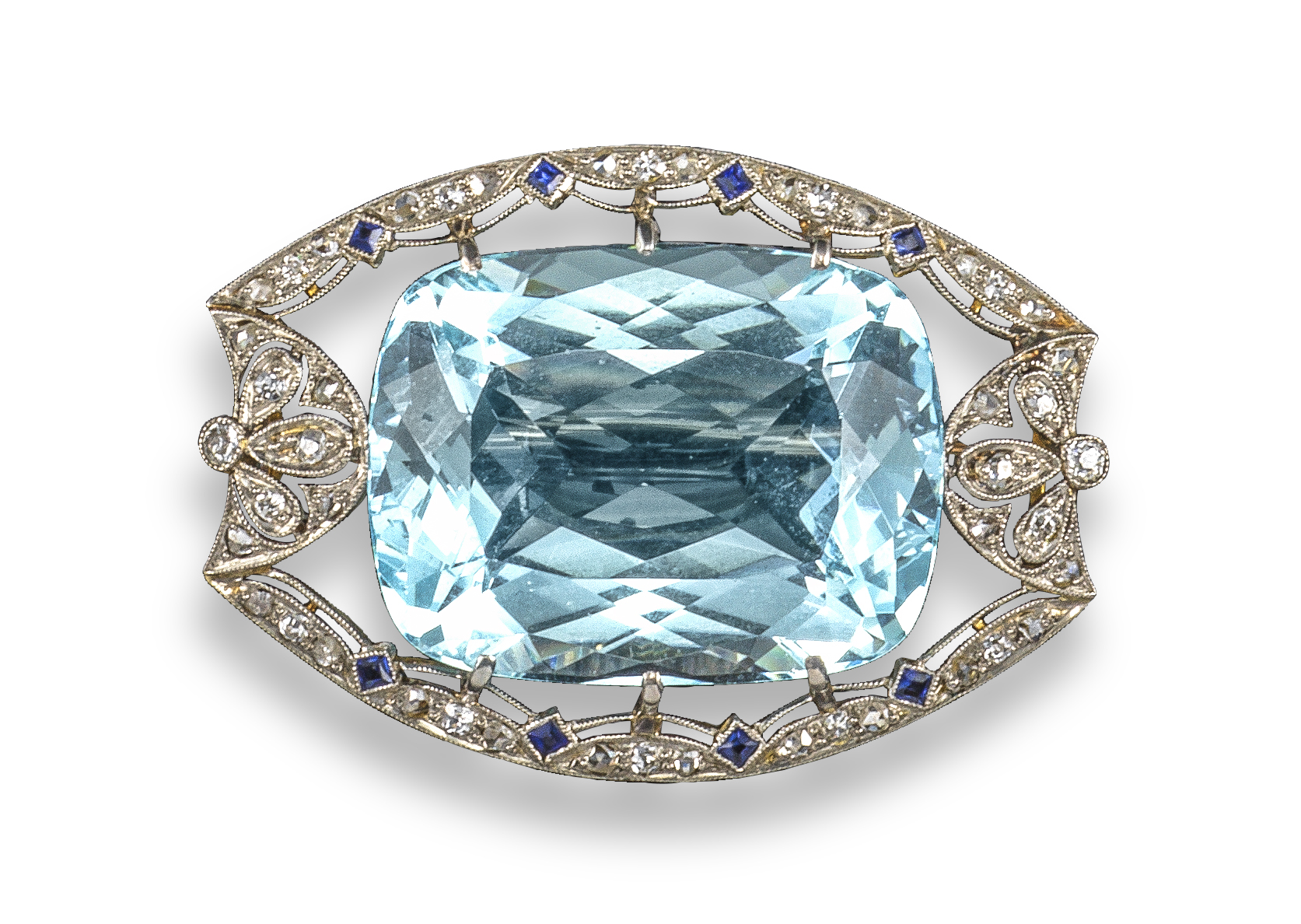 An aquamarine, sapphire and diamond brooch, the cushion-shaped aquamarine weighs approximately 43cts, set within scallop edged sapphire and diamond border in platinum and gold, 4cm wide, case