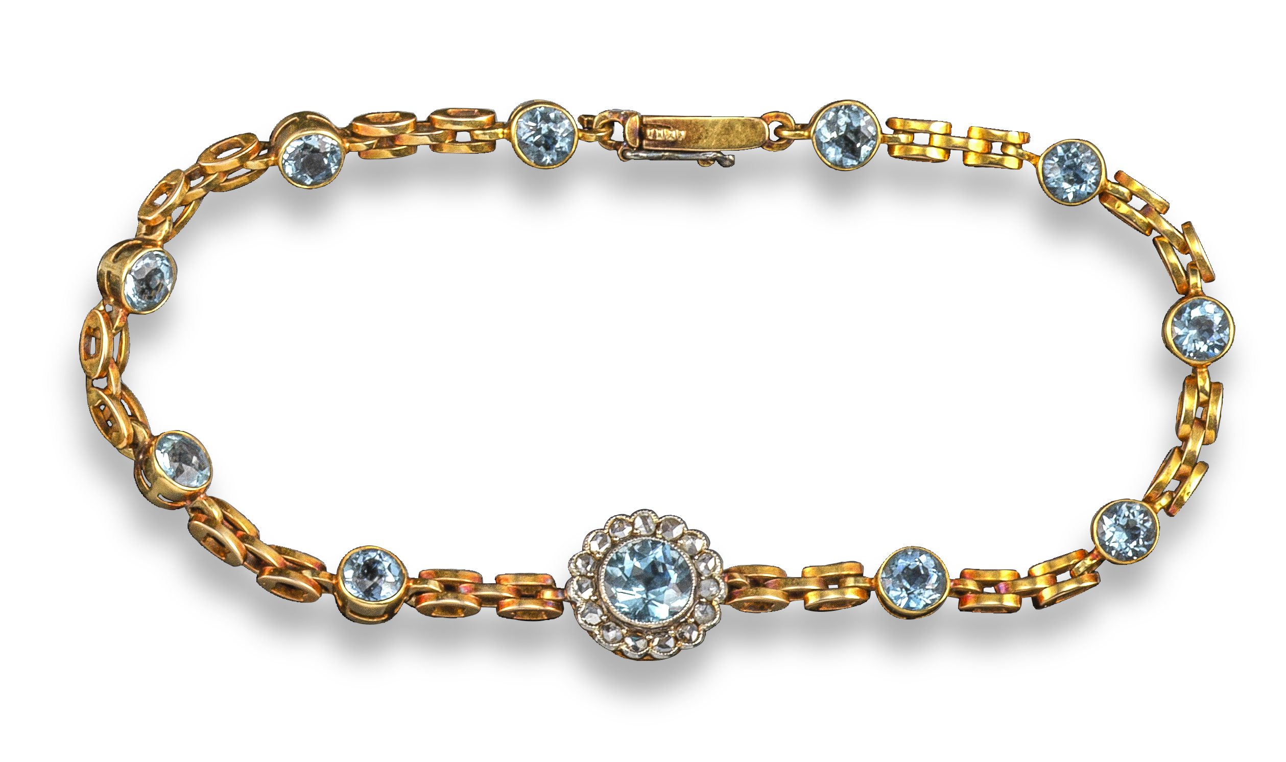 An Edwardian aquamarine and diamond bracelet, set with a central aquamarine and diamond cluster on yellow gold bracelet set with smaller aquamarines, 17.5cm long