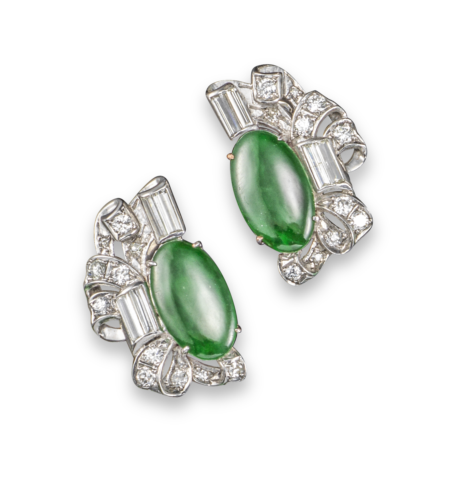 A pair of jadeite and diamond scroll earrings, the oval jade cabochons set within scrolling surround of baguette-shaped and circular-cut diamonds in white gold, 2.8cm wide