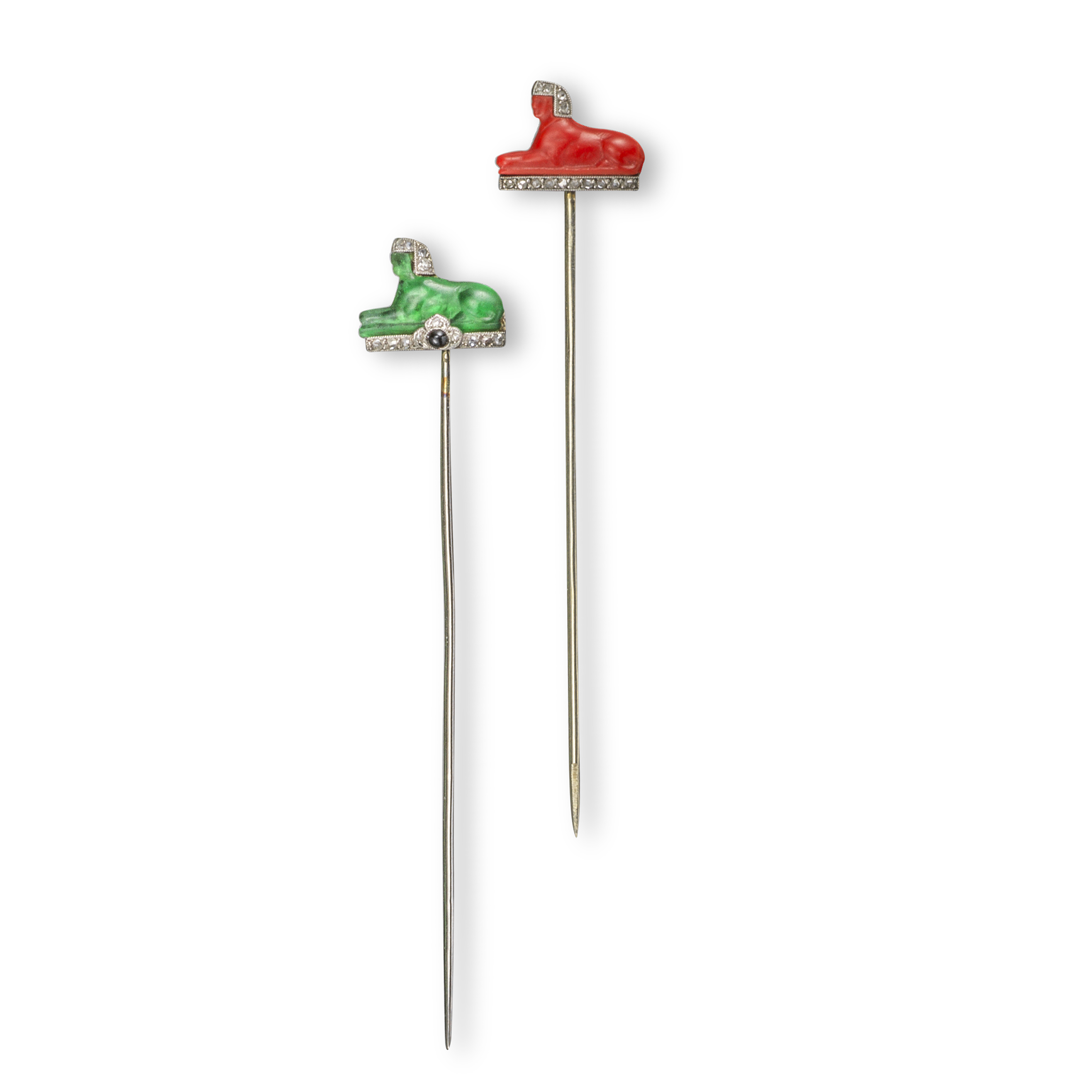 A sapphire and diamond-set sphinx stickpin by Ghiso, the green glass body on a sapphire and diamond plinth, with a diamond headdress in platinum and white gold, signed to reverse, with a matching red glass sphinx stickpin, unsigned, each 13mm wide