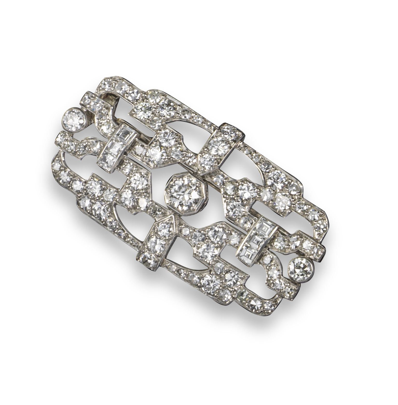 An Art Deco diamond brooch, set overall with graduated old circular-cut and square-shaped diamonds in platinum and white gold, 4cm wide