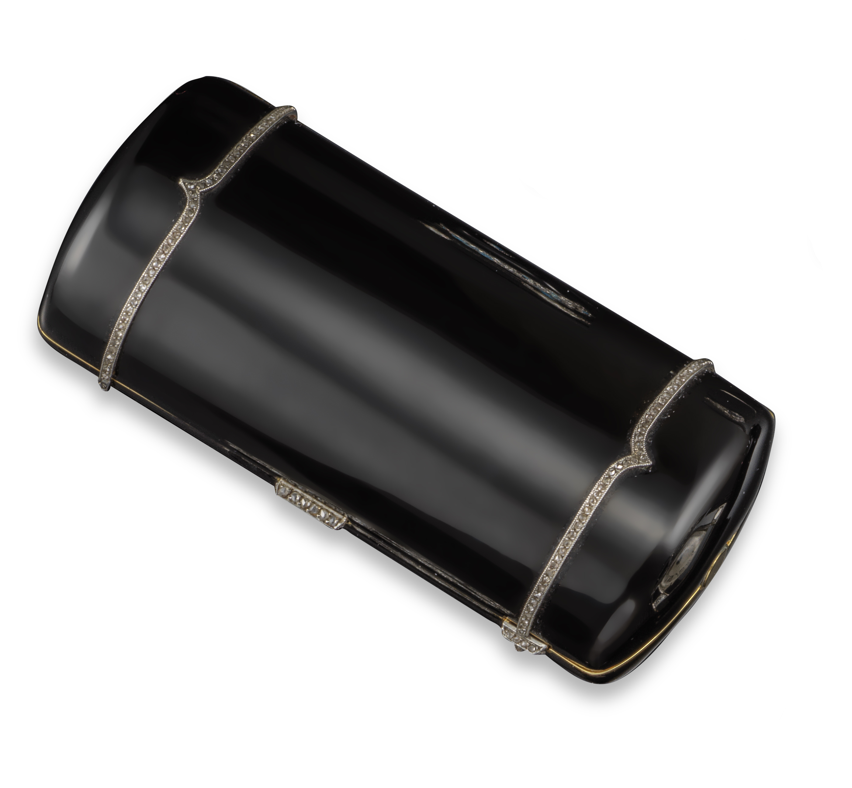 An Art Deco black enamel minaudière, with tapered linear diamond decoration and a diamond thumbpiece, with detachable gold pencil, hinged opening and a mirror to interior, 8.5cm long, 142g