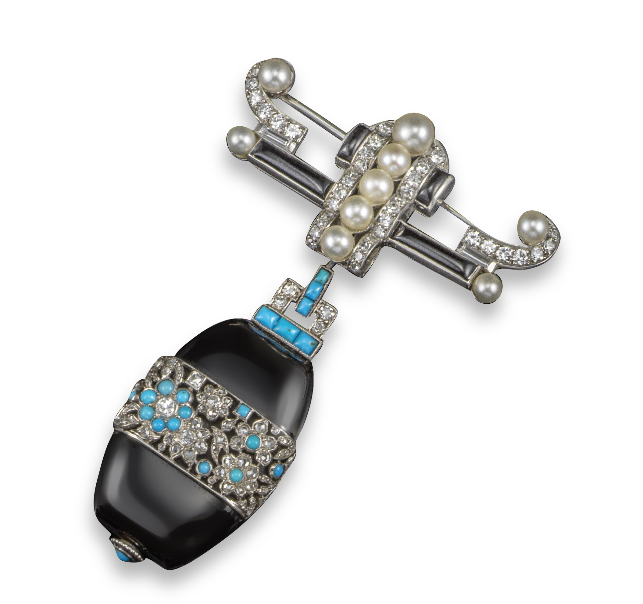 An Art Deco gem-set and enamel fob watch, the brooch set with pearls, diamonds and black onyx, suspending a detachable black enamel watch with turquoise and diamond foliate decoration, manual movement, turquoise winder, 6.2cm long