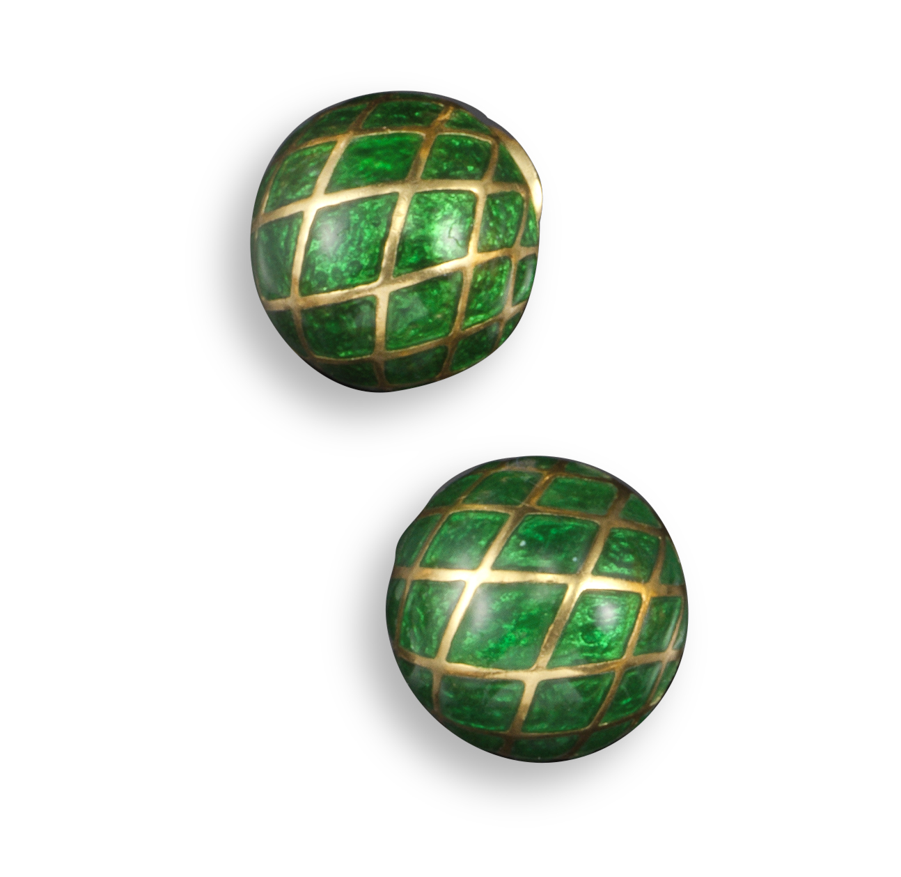 A pair of enamel and gold earrings by David Webb, the domed earrings with green guilloche enamel decoration between cross weave lattice pattern in yellow gold, signed, clip fittings, 1.6cm long