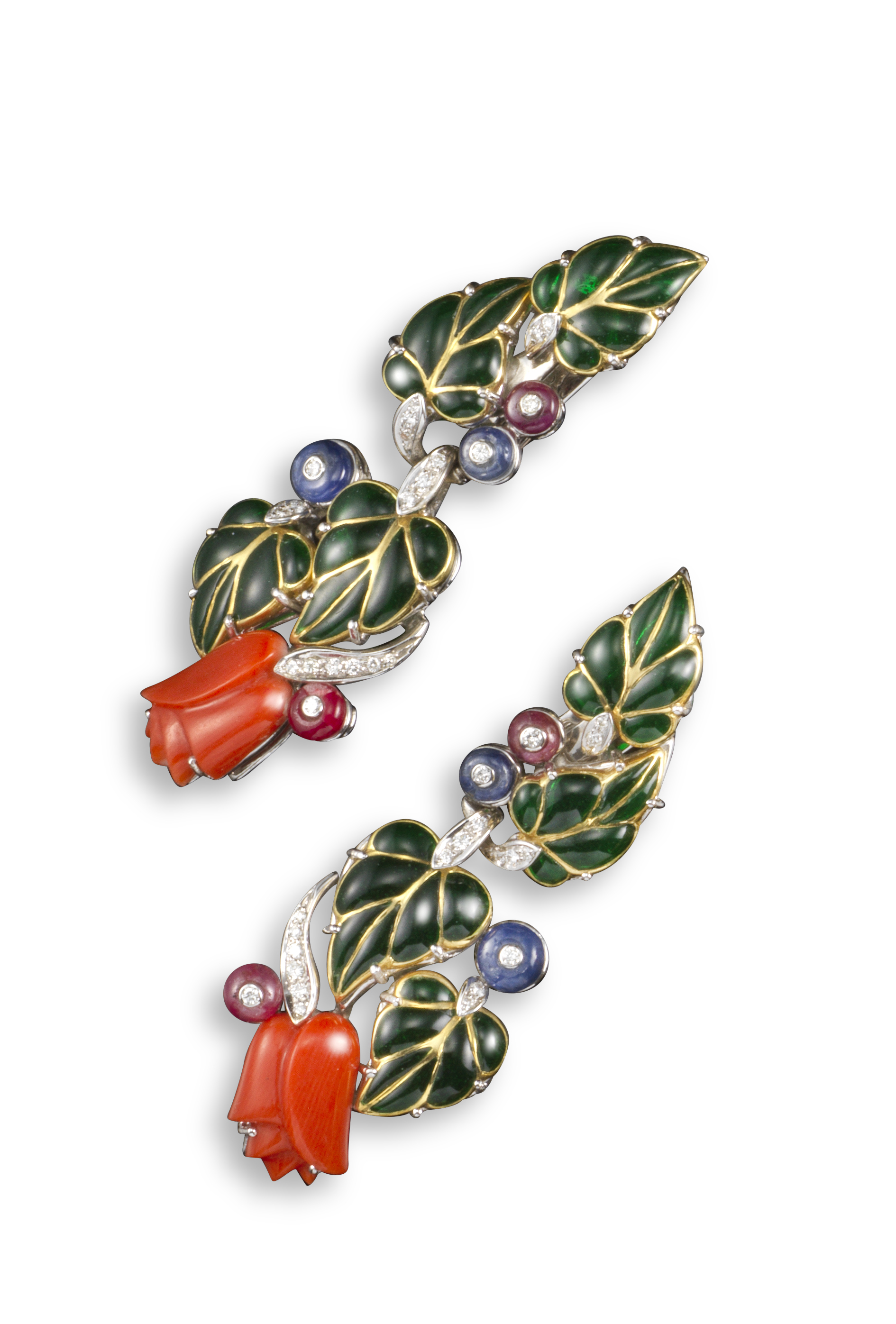 λ A pair of gem-set and plique-à-jour enamel earrings, of foliate design and set with sapphires, rubies, circular-cut diamonds and a carved coral flower head, with green plique-à-jour enamel decoration in yellow and white gold, Italian hallmarks, post and clip fittings, each 5.5cm high