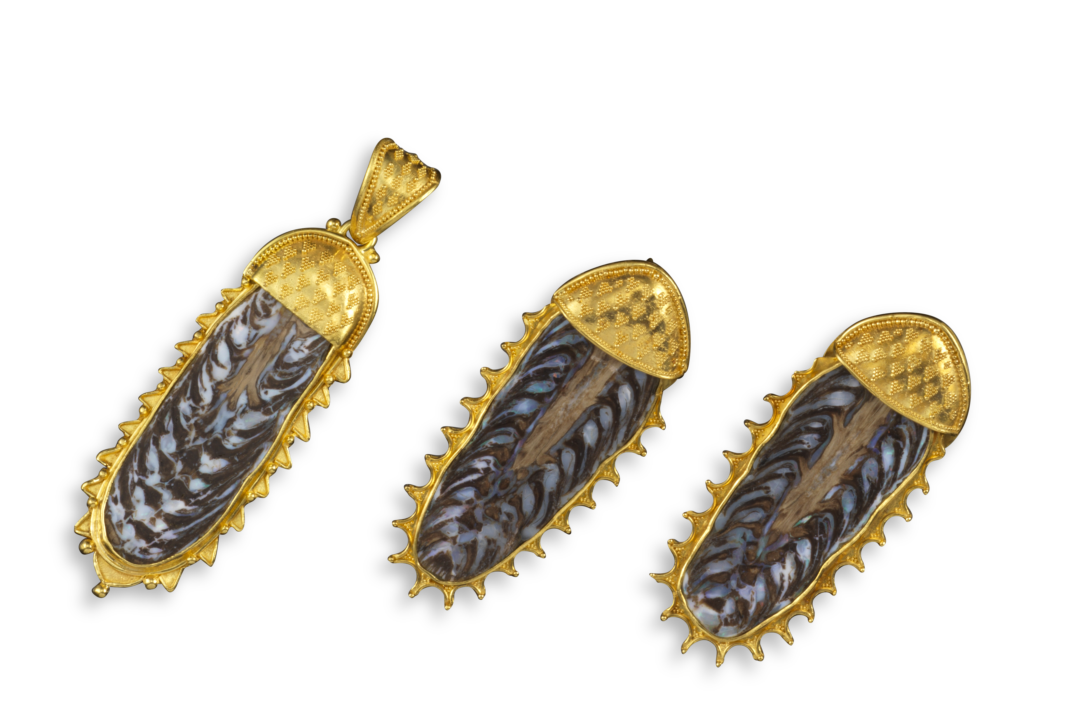 A suite of boulder opal-set gold jewellery, comprising a pendant and earrings, the plaques of boulder opal set in gold with wirework and pellet decoration, signed Lunad, pendant 6.5cm high, earrings with post and clip fittings, 5cm high