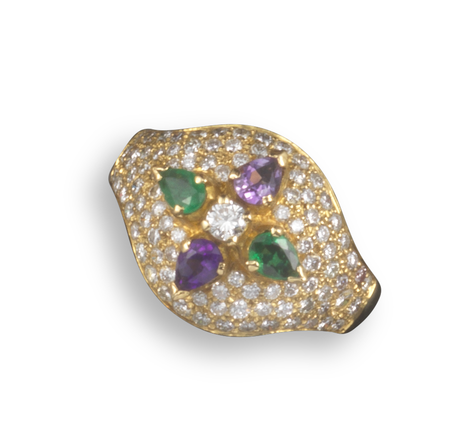 A diamond and gem-set gold bombé ring, pavé-set with round brilliant-cut diamonds and pear-shaped emeralds and amethysts in yellow gold, size M