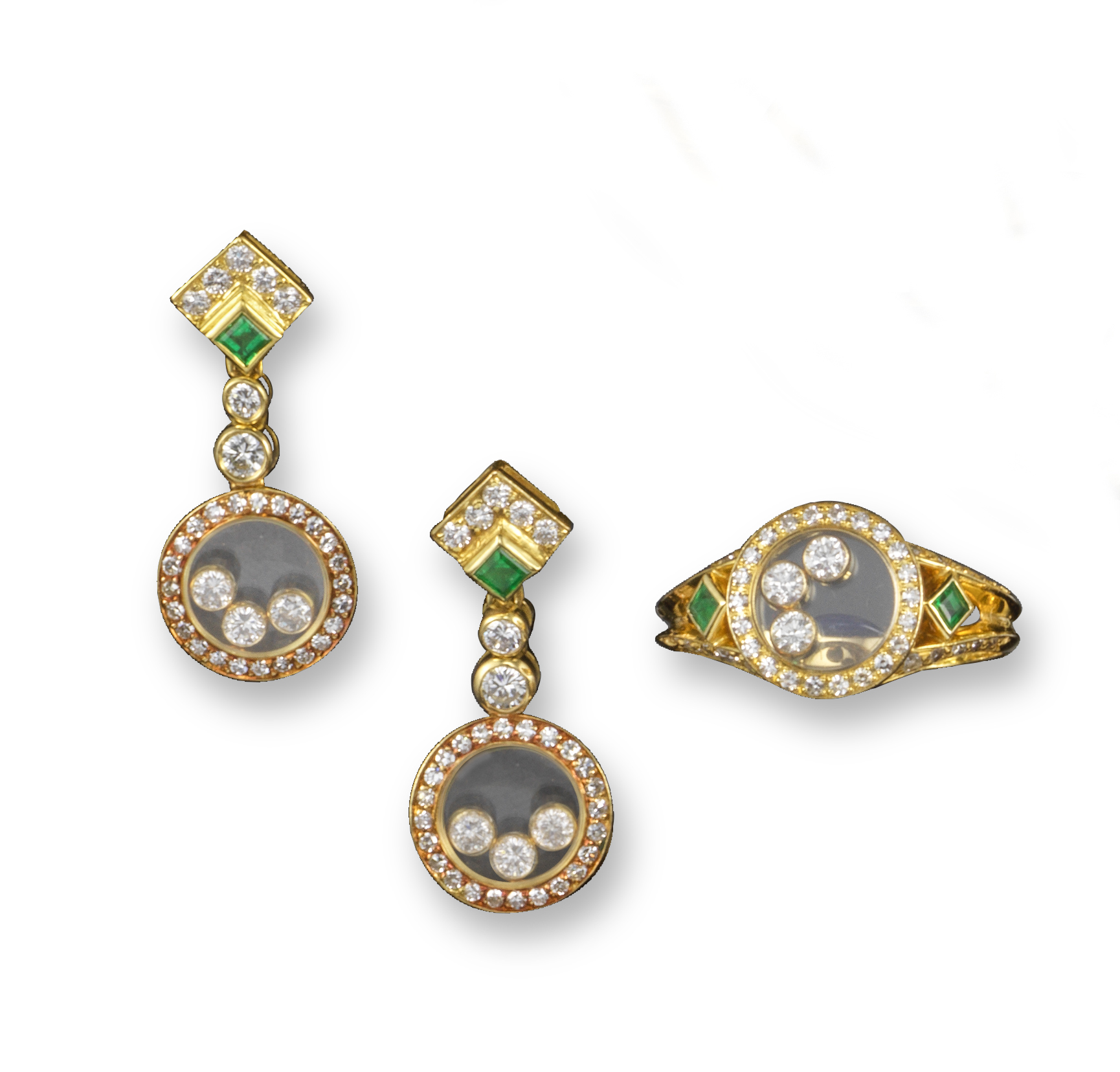 A pair of 'Happy Diamonds' earrings and by Chopard, the earrings set with round brilliant-cut diamonds and square-shaped emeralds in yellow gold, the diamond-set glazed centre sections suspend lose diamonds within, signed Chopard, each 2.7cm high, together with a ring with bifurcated shoulders and set with further circular-cut diamonds to the gallery, ring size O 1/2 (ring not signed)