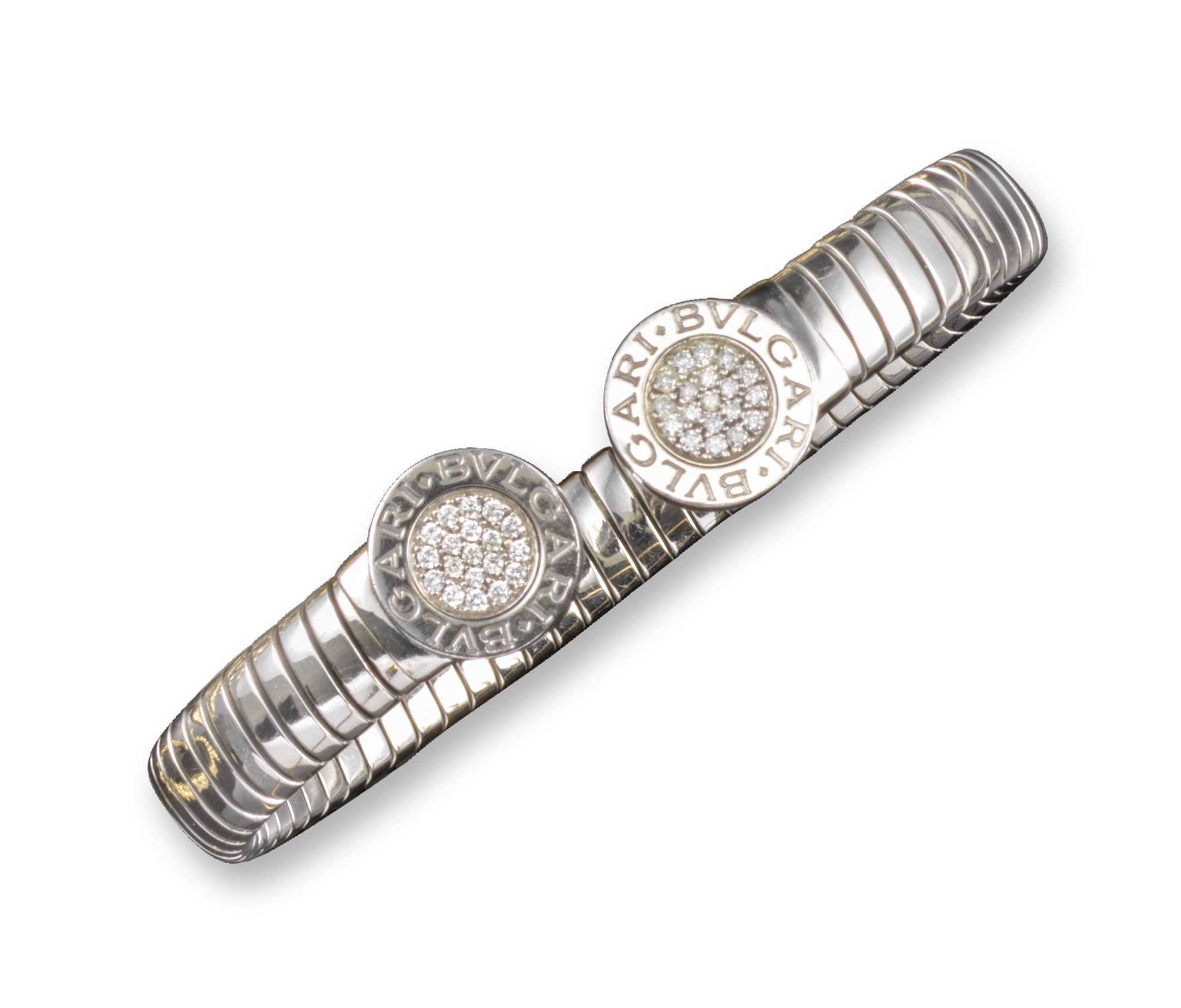 A steel 'Tubogas' bangle by Bulgari, the terminals pavé-set with circular-cut diamonds and engraved Bulgari, with a flexible grooved steel band, 6cm inner diameter