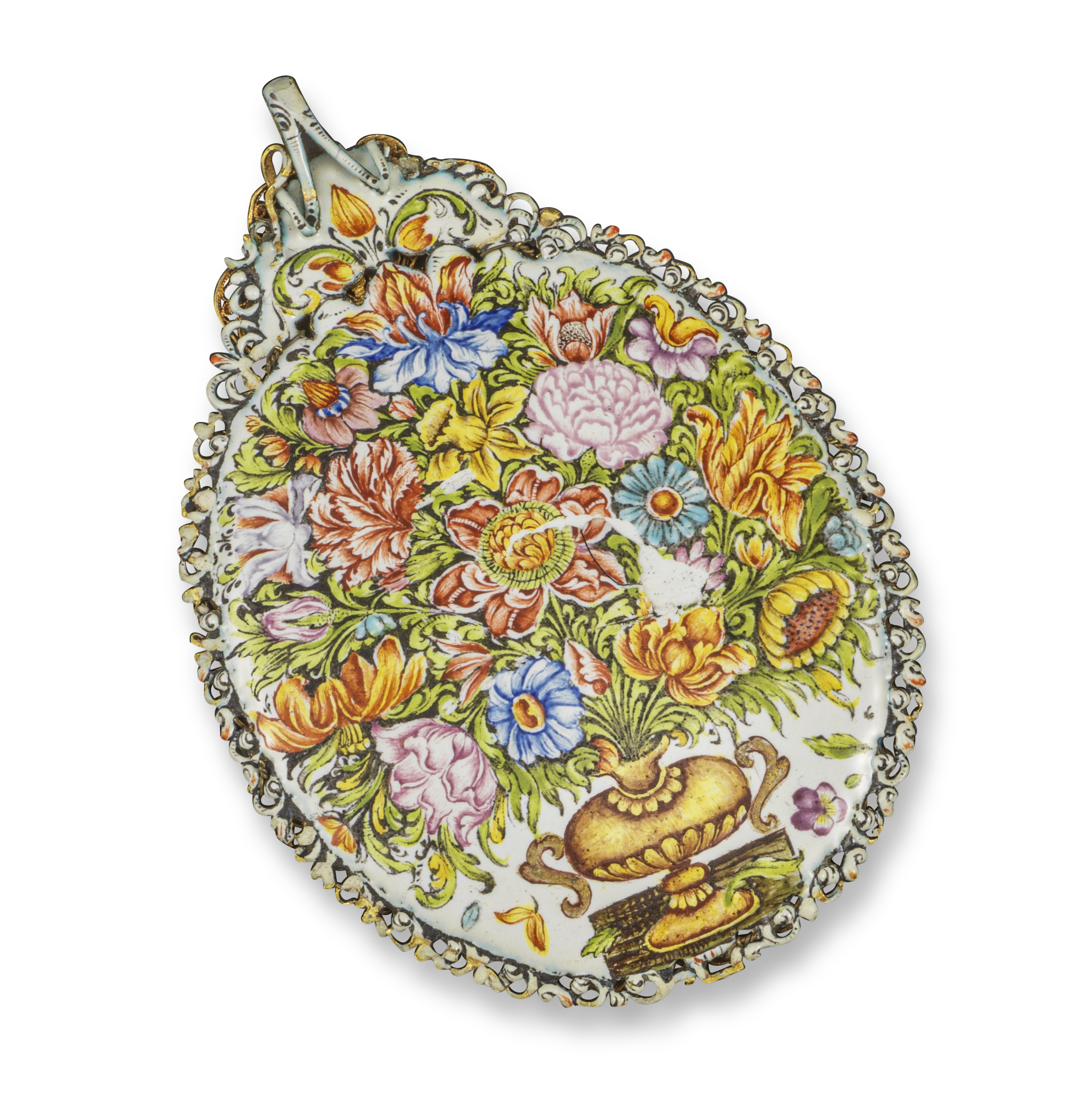 A mid 17th century gold locket pendant, probably French, sumptuously painted in polychrome enamel with flowers including tulips with gold decoration to the handles of the urn on a plinth, white enamel ground, tightly scrolled border, bifurcated suspension loop, counter enamelled in blue within fine filigree surround, 9cm high