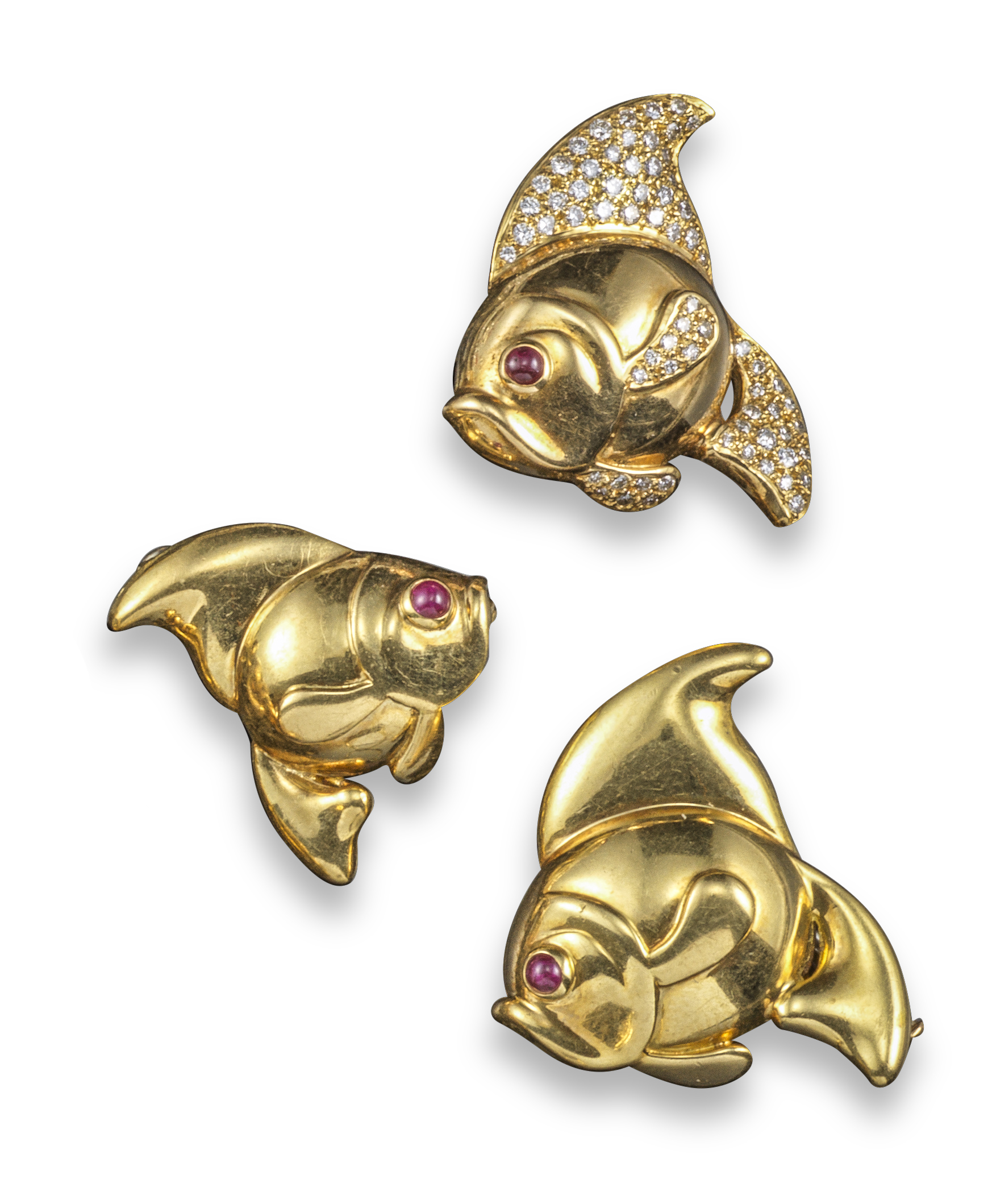 A set of three graduated gold fish brooches, with ruby cabochon eyes, one pave-set with diamond fins in yellow gold, largest 3cm high