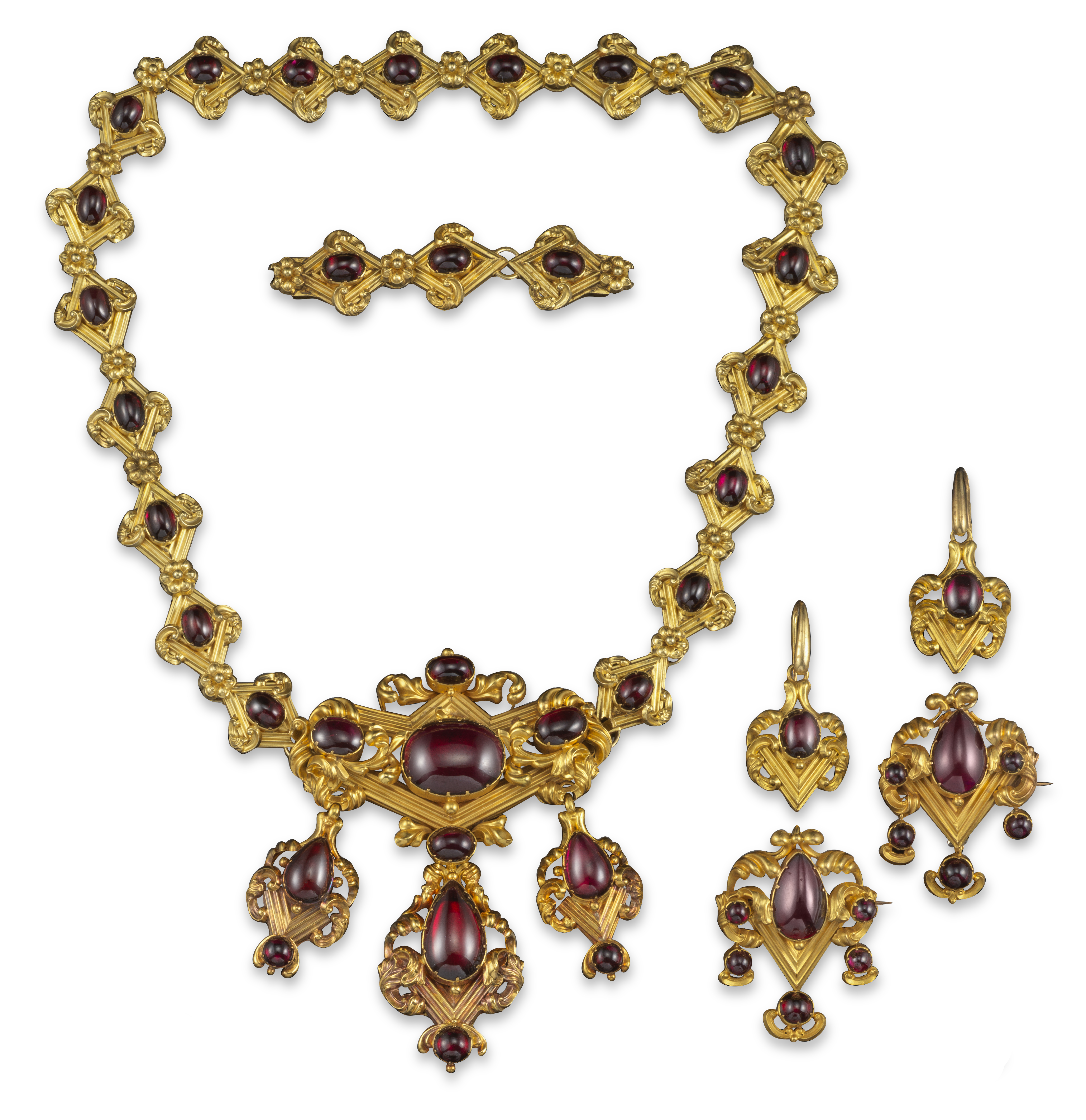 A Victorian garnet and gold parure, comprising a necklace, the lozenge-shaped gold links each set with a garnet cabochon and conjoined with a gold flowerhead and scrolling decoration, with three detachable articulated pendants and a detachable centrepiece which can be worn as a brooch, with matching earrings and two brooches (converted from earrings) and a necklace extension, necklace 42cm, long, earrings 4cm long, brooches 4cm long, extension 6.5cm long, fitted case