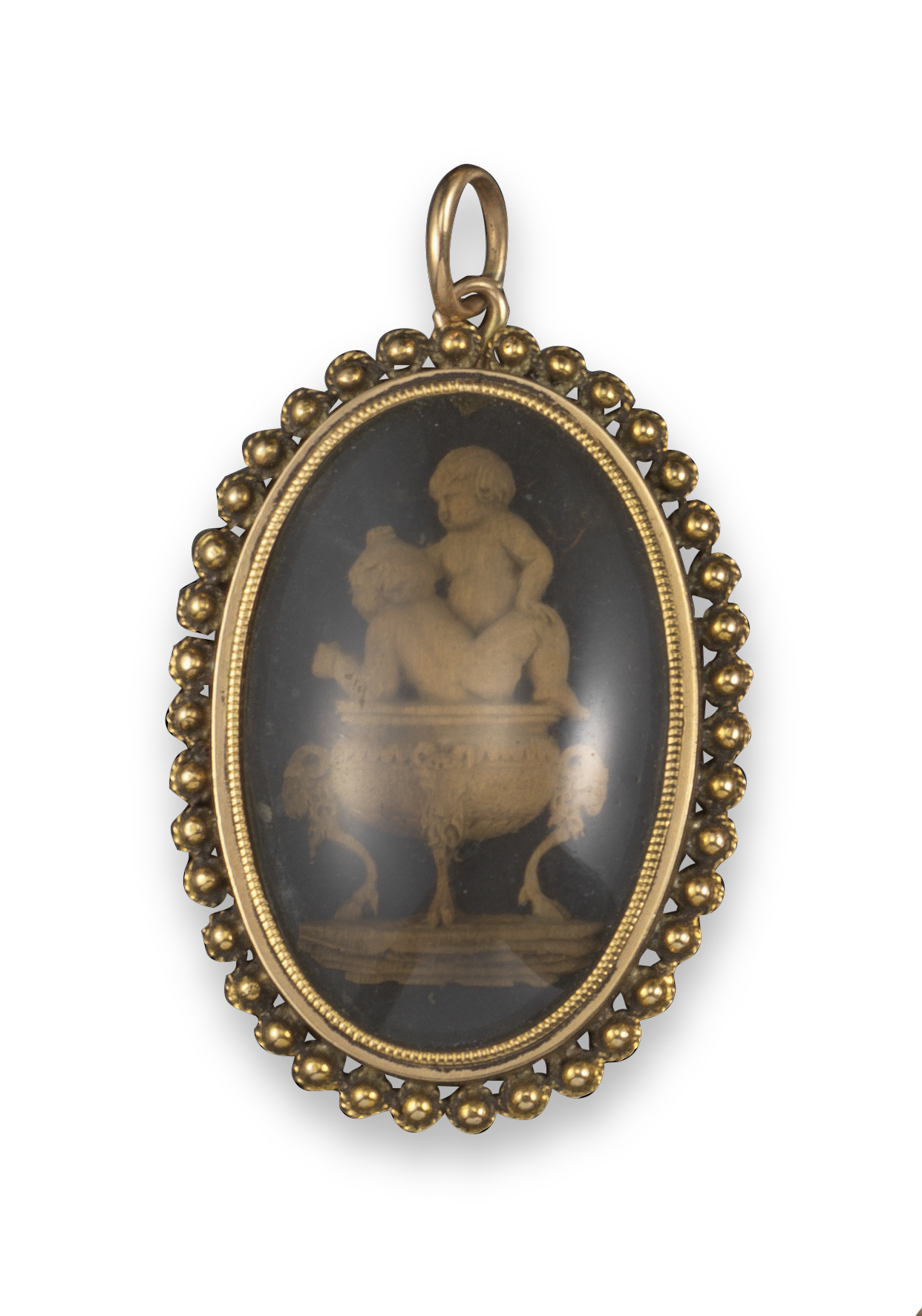 An early 19th century boxwood pendant attributed to Giuseppe Bonzanigo (1745 - 1820), depicting two putti in boxwood on ebonised wood ground, glazed and in gold surround, 4.2cm high