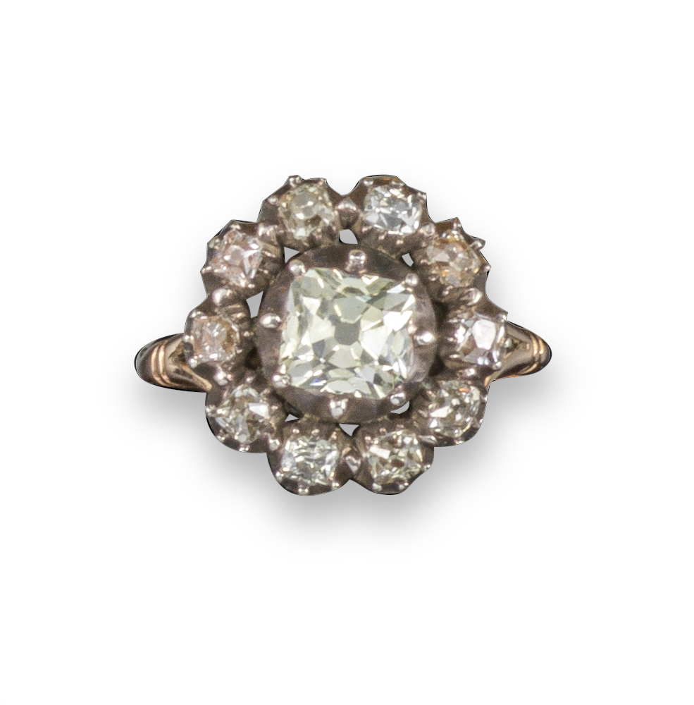 A George III diamond cluster ring, set with a central old cushion-shaped diamond within a border of smaller diamonds in silver and gold, size O 1/2
