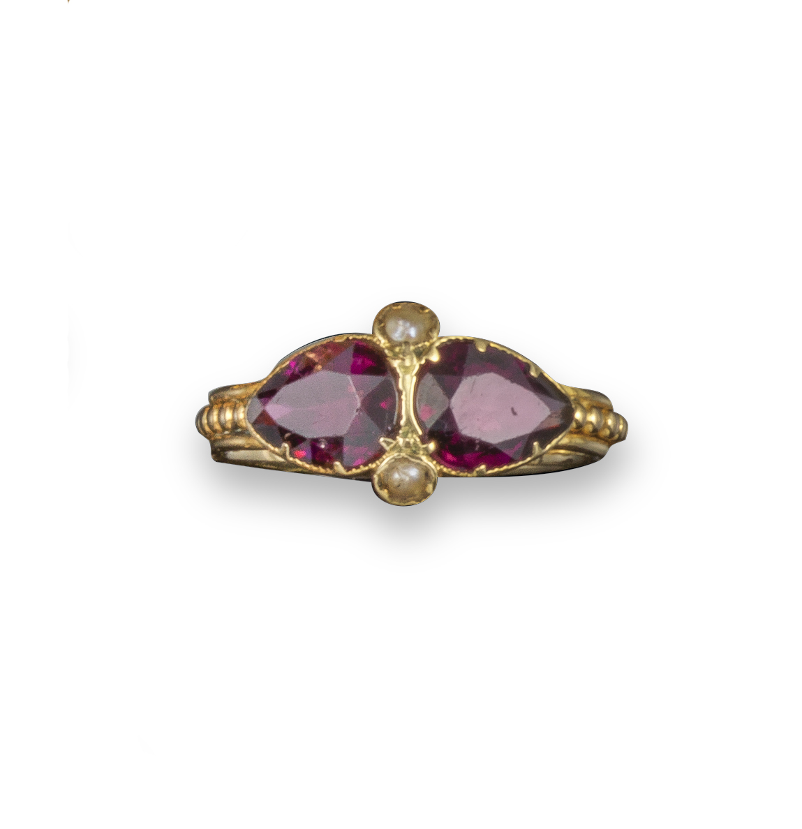 A 19th century double garnet ring, set with two pear-shaped garnets and seed pearls in yellow gold mount with pellet-decoration to the shank, size O