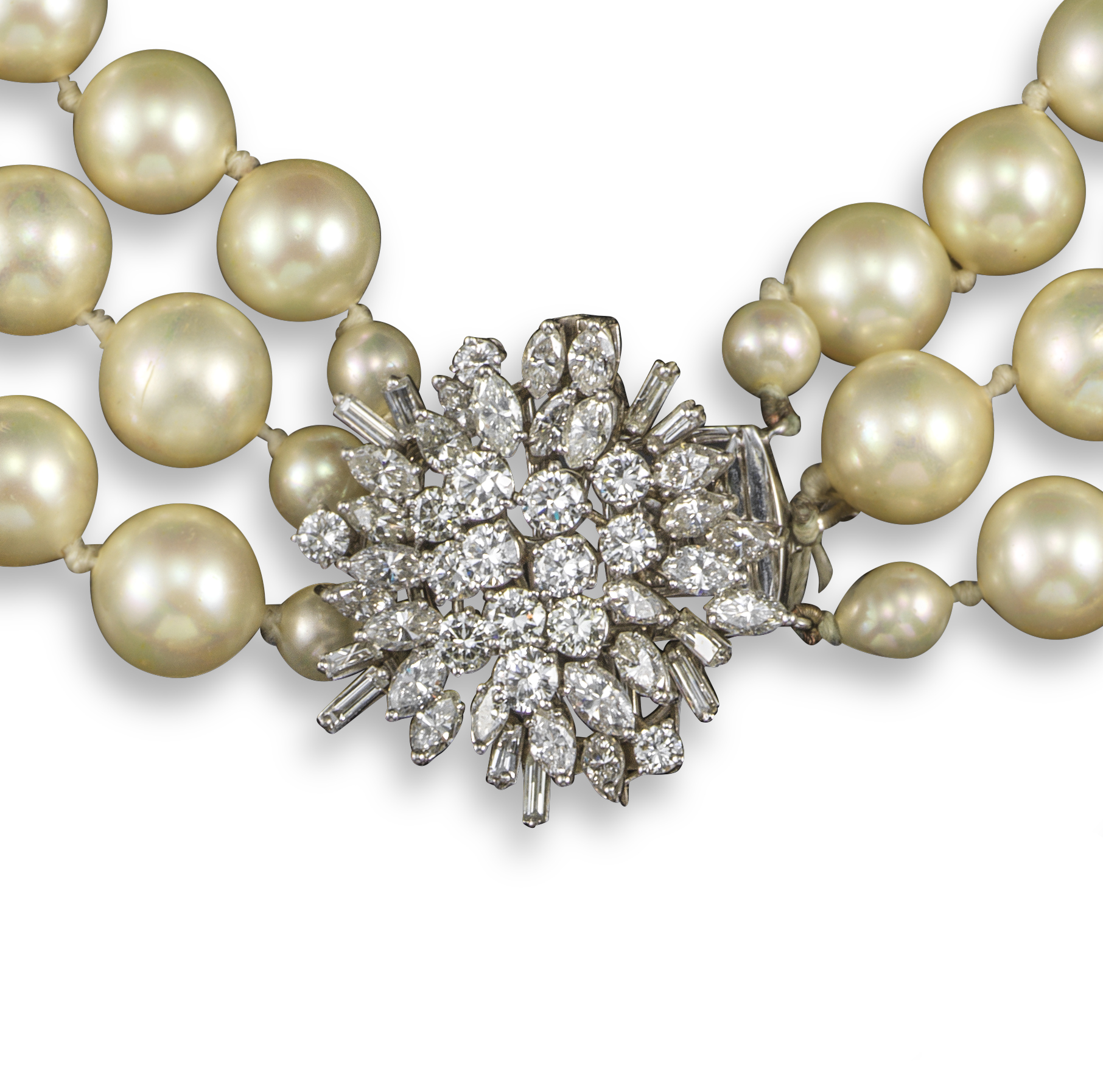 A diamond-set cluster clasp, set with round brilliant-cut, marquise and tapered baguette-shaped diamonds in white gold, total diamond weight approximately 6.50cts, on a three-row artificial pearl necklace