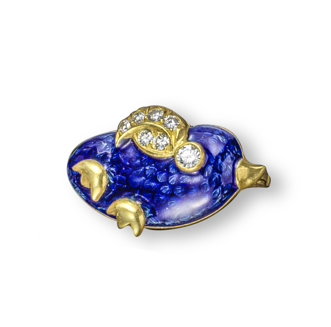 A stylised gold bird brooch, decorated with blue enamel with a diamond eye and wing in yellow gold, rubbed French marks, 2.6cm wide