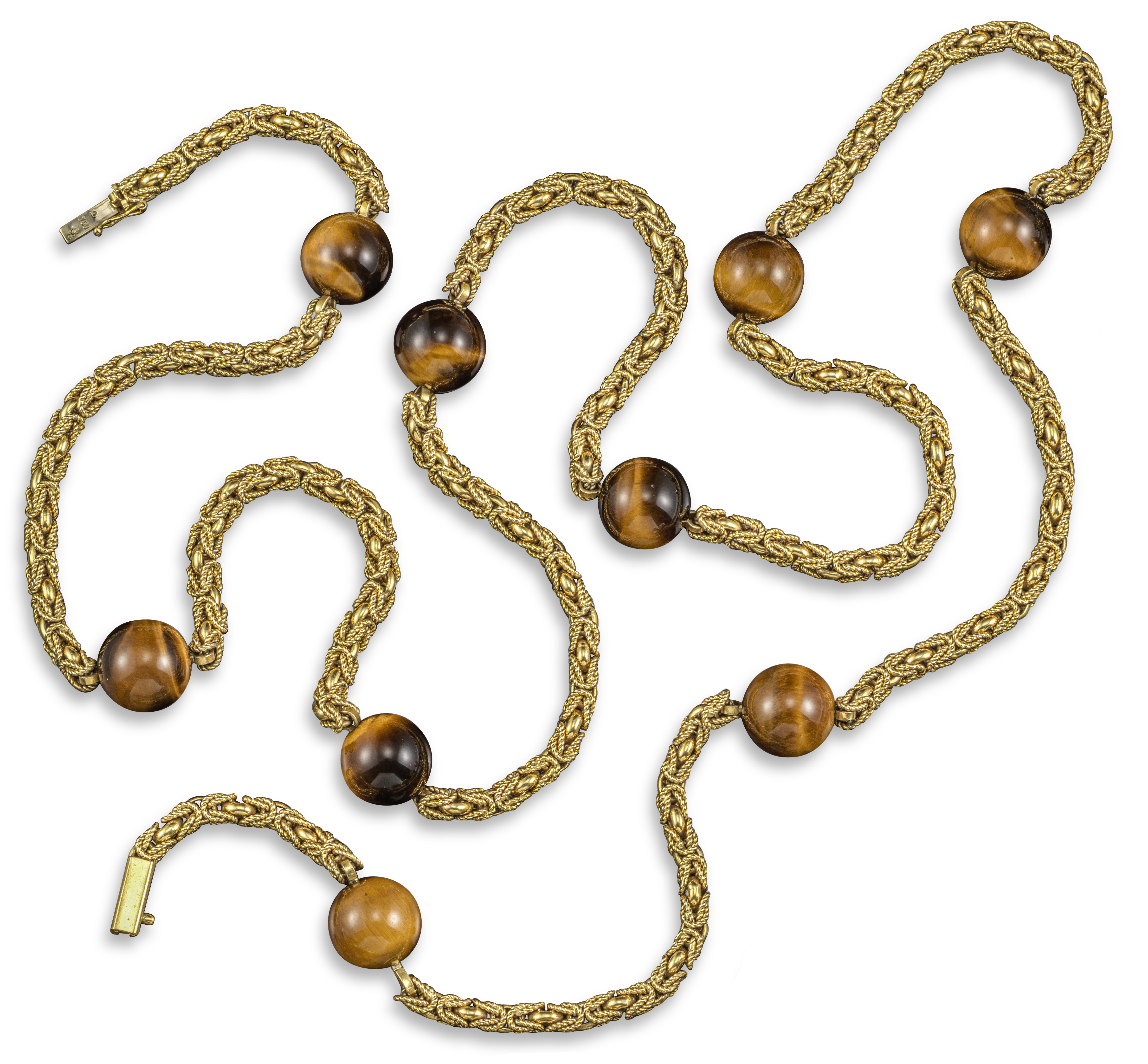 A yellow gold long chain, set with spherical tiger's eye beads between textured fancy-link sections in yellow gold, stamped 750 and with Austrian control marks, 99cm long, 148g