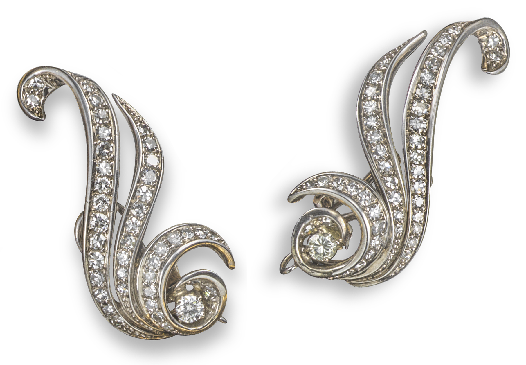 A pair of diamond scroll earrings, set with graduated circular-cut diamonds in white gold and platinum, 4cm high