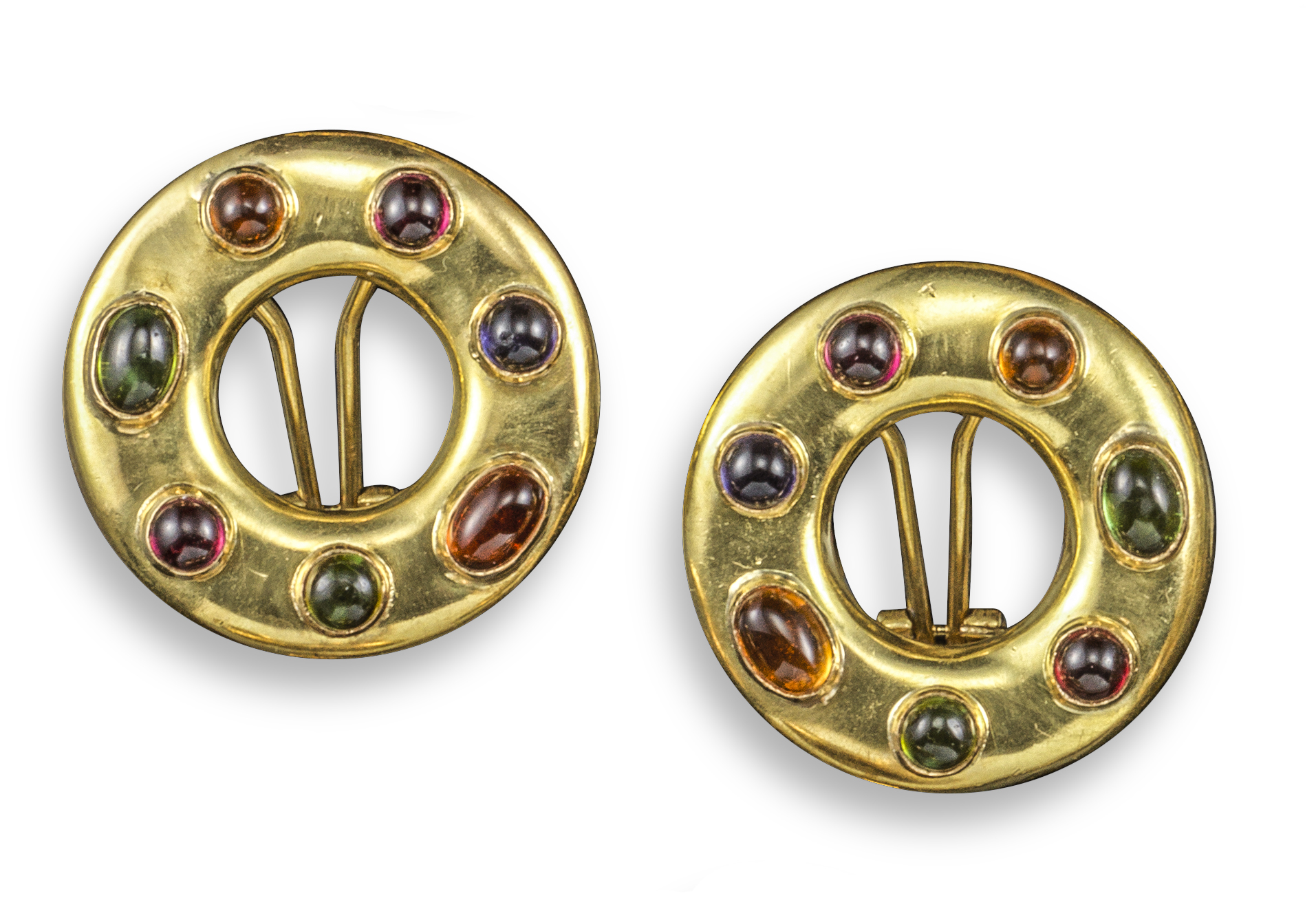 A pair of gem-set gold disc earrings, set with cabochon tourmalines and citrines in yellow gold, 2.7cm wide