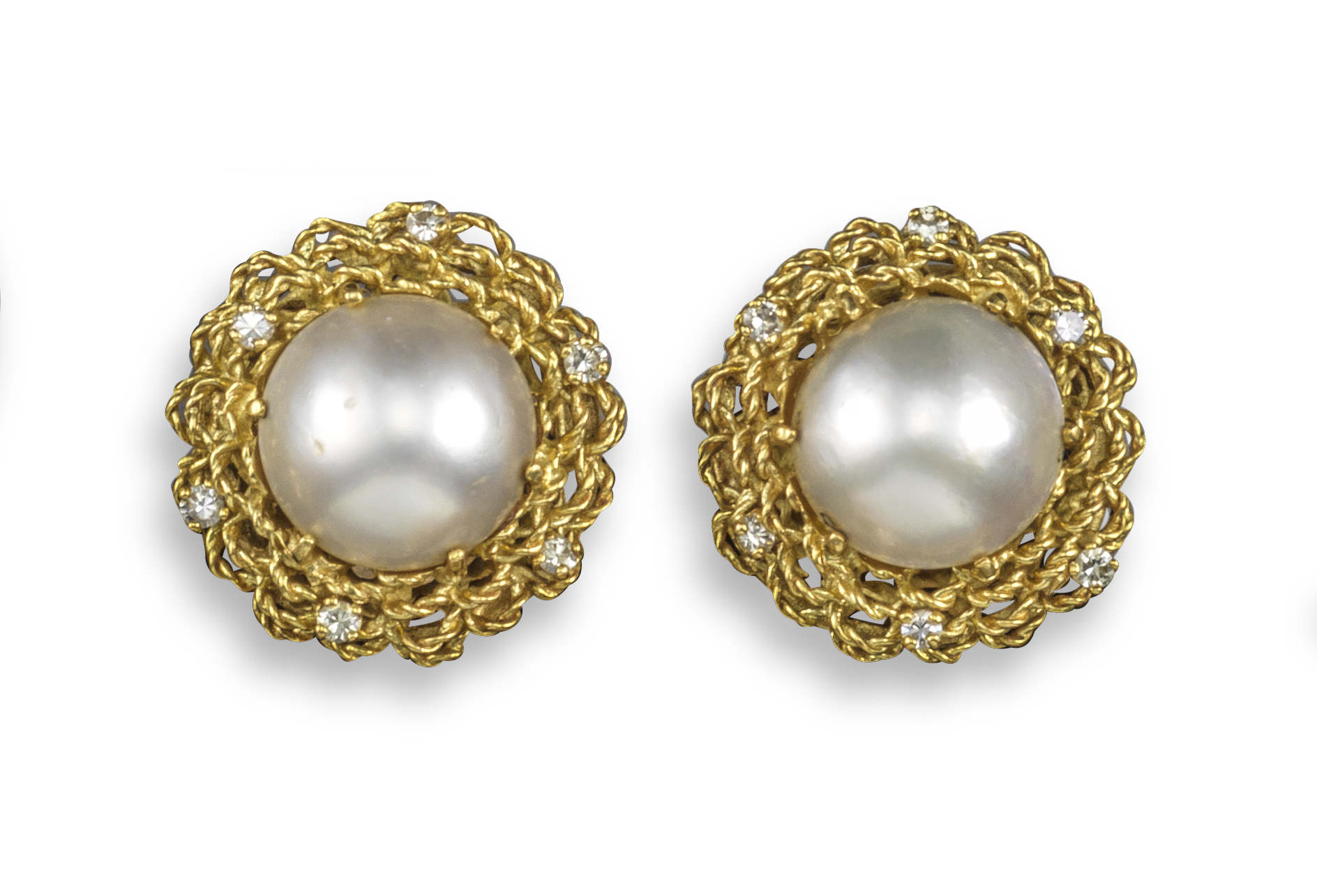 A pair of cultured mabe pearl and diamond bombe earrings, set within twisted rope borders in yellow gold, 2.4cm wide, post fittings