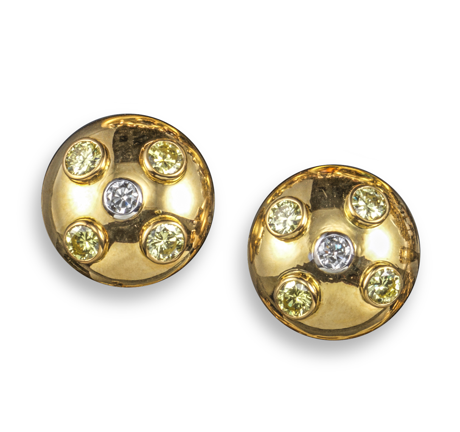 A pair of gold bombé earrings, each set with a white diamond and four fancy yellow diamonds in yellow and white gold collets, 2cm wide