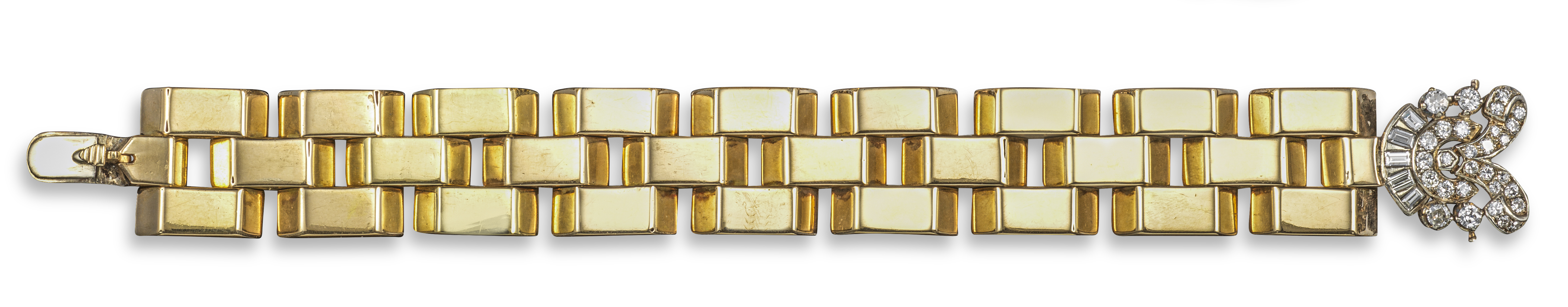 A tank track gold bracelet, terminating in a diamond-set gold scroll clasp, 18.8cm long