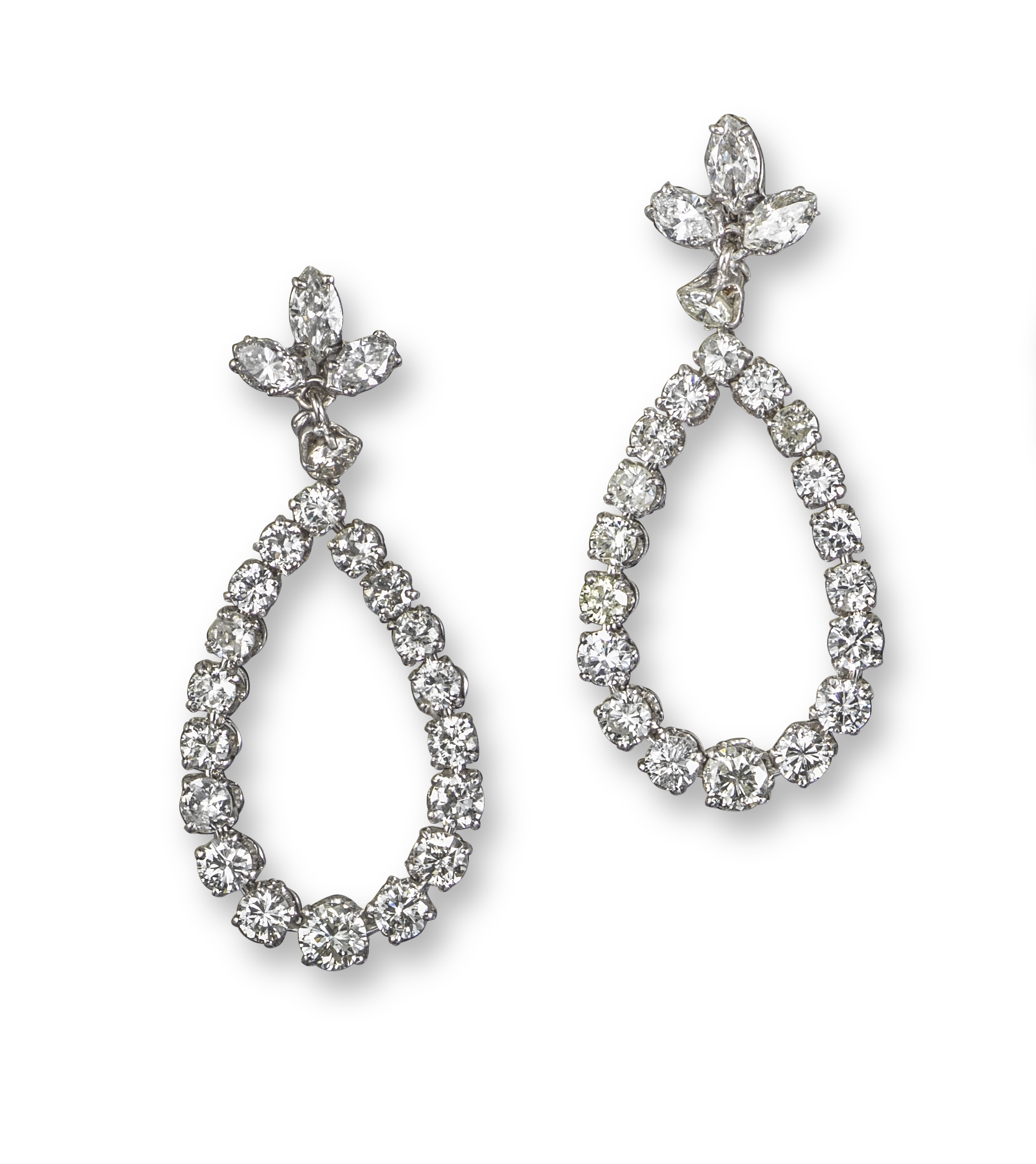 A pair of diamond drop earrings, the marquise-shaped trefoils suspend diamond drops in white gold, 4.8cm high