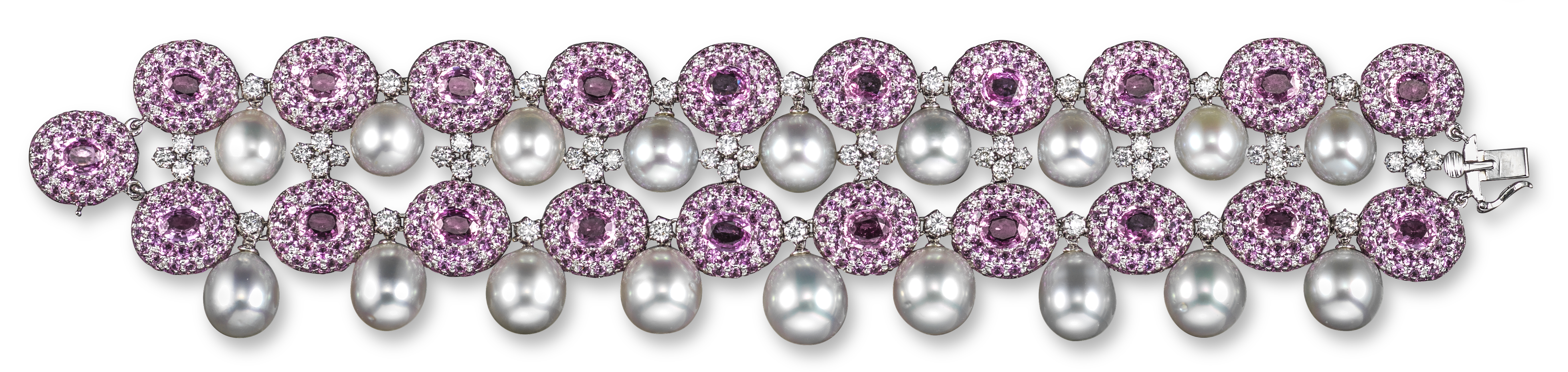 A pink sapphire and diamond bracelet, the two rows of pink sapphire clusters set with diamonds and divided by diamond quatrefoils and cultured pearls in white gold, 18cm long, 3.5cm wide