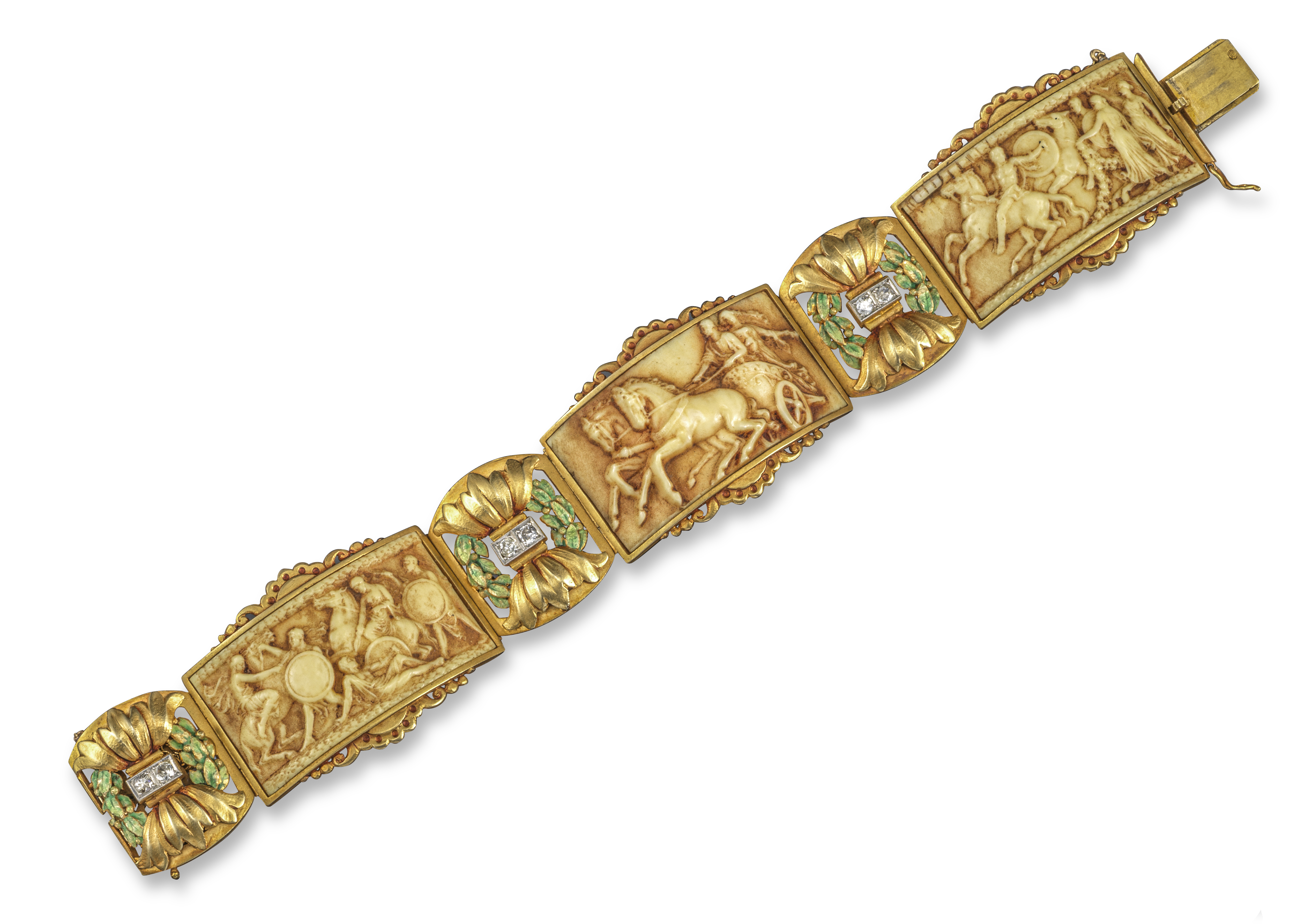 λ An Art Nouveau diamond and enamel gold bracelet, set with three panels of carved ivory and three gold panels set with diamonds within green enamel laurels, French marks, 18cm long
